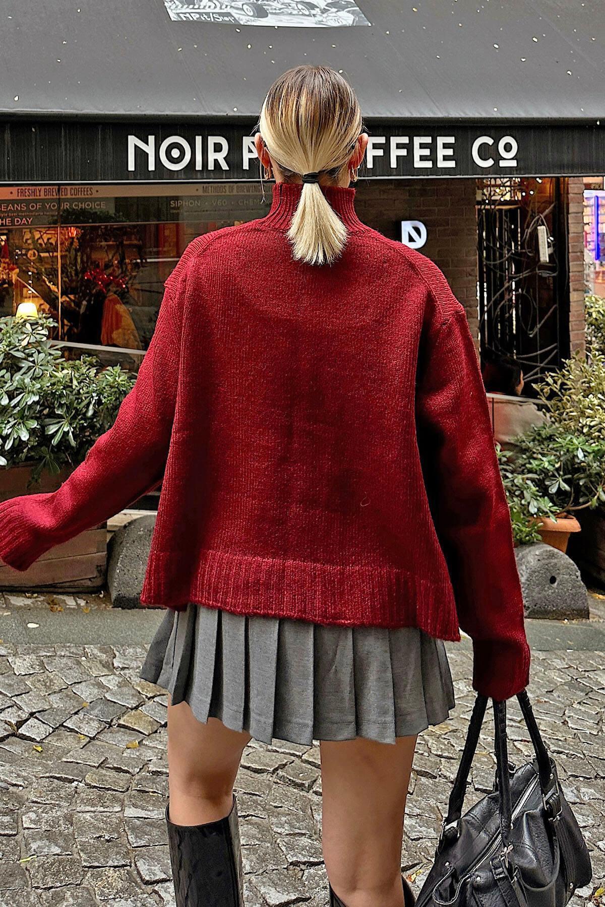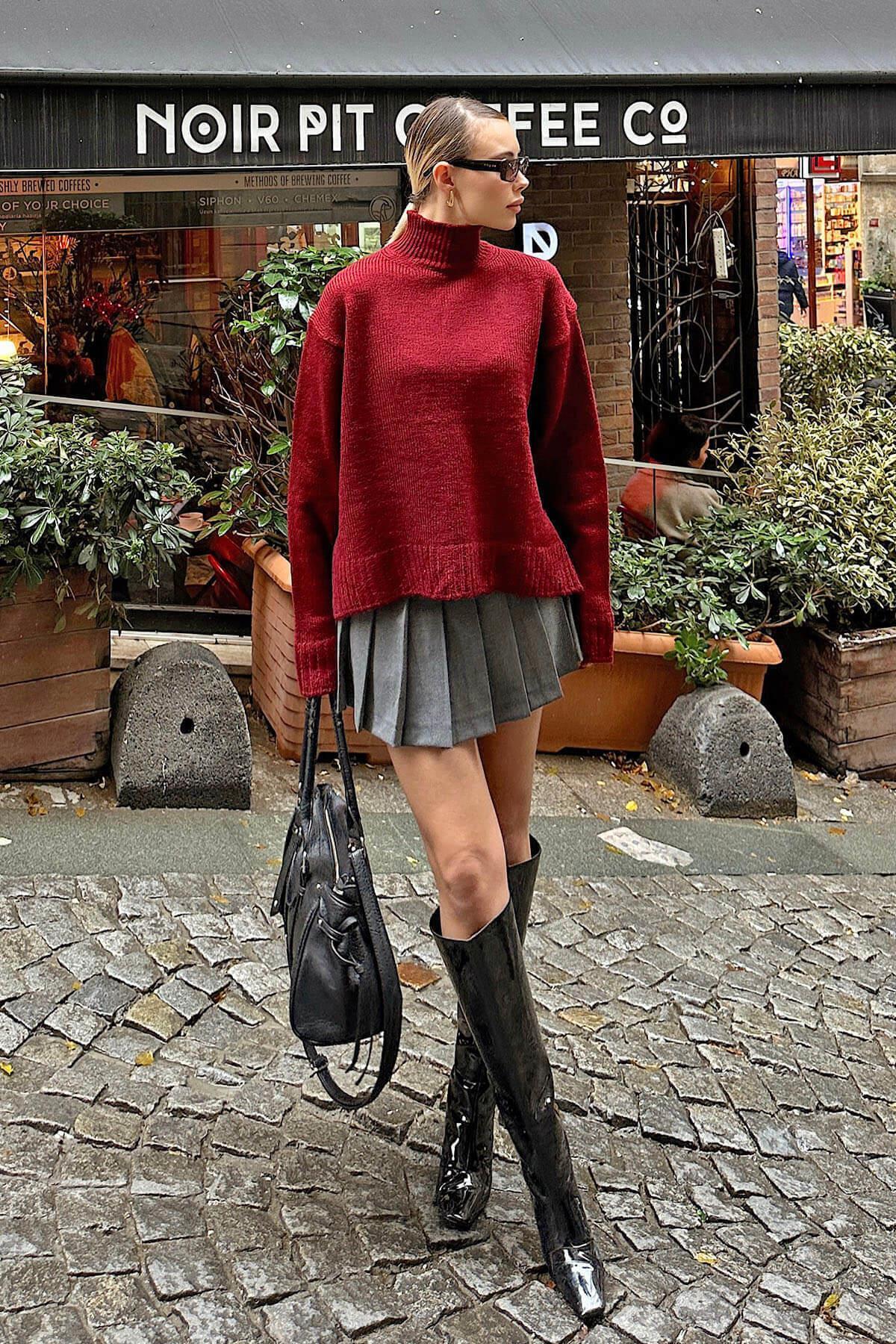 Bordo Yan Yırtmaçlı Basic Yarım Balıkçı Reglan Kol Kadın Triko Kazak Bordo Yan Yırtmaçlı Basic Yarım Balıkçı Reglan Kol Kadın Triko Kazak 26882 Standart