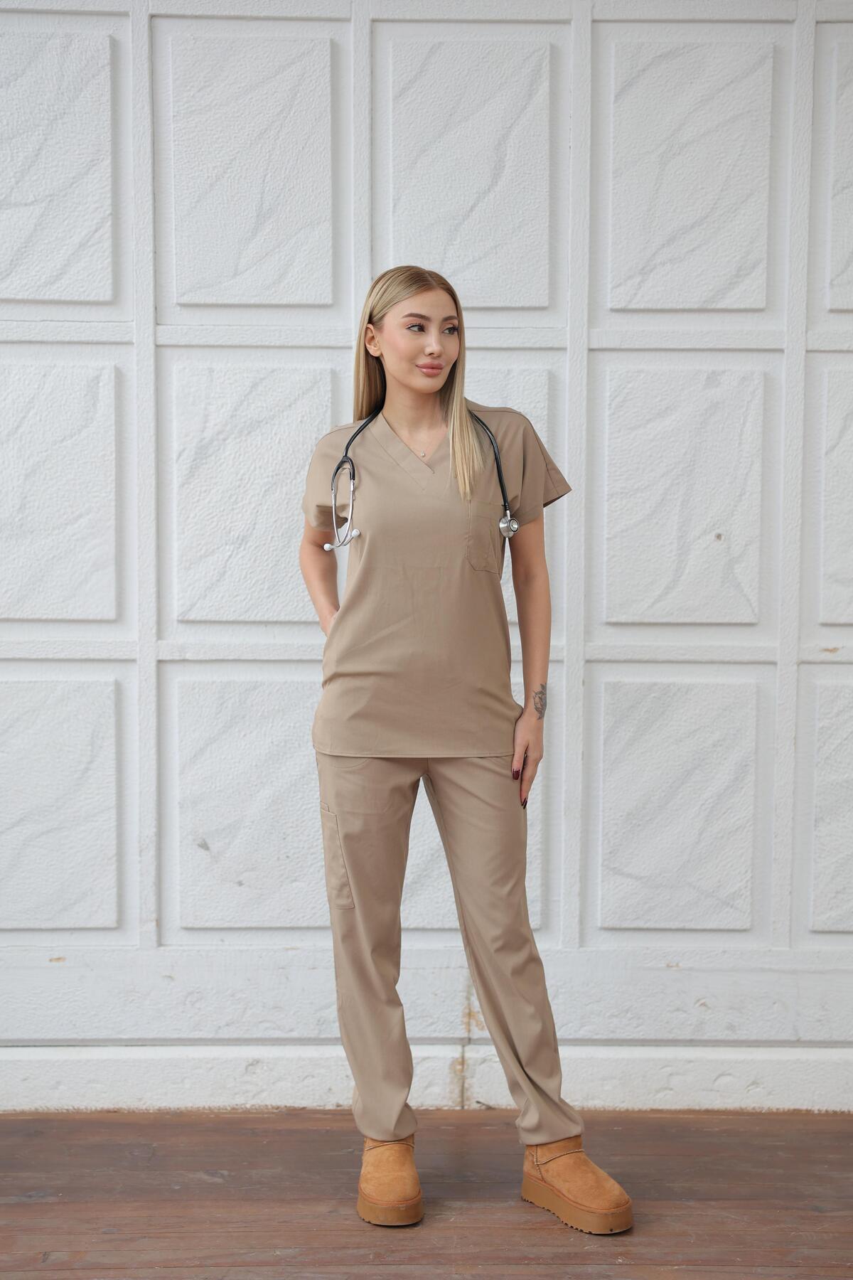 BEJ Likralı Unisex Yarasa Kol Hemşire Ve Doktor Forması Takımı Scrubs Hastane Üniforması BEJ Likralı Unisex Yarasa Kol Hemşire Ve Doktor Forması Takımı Scrubs Hastane Üniforması XL