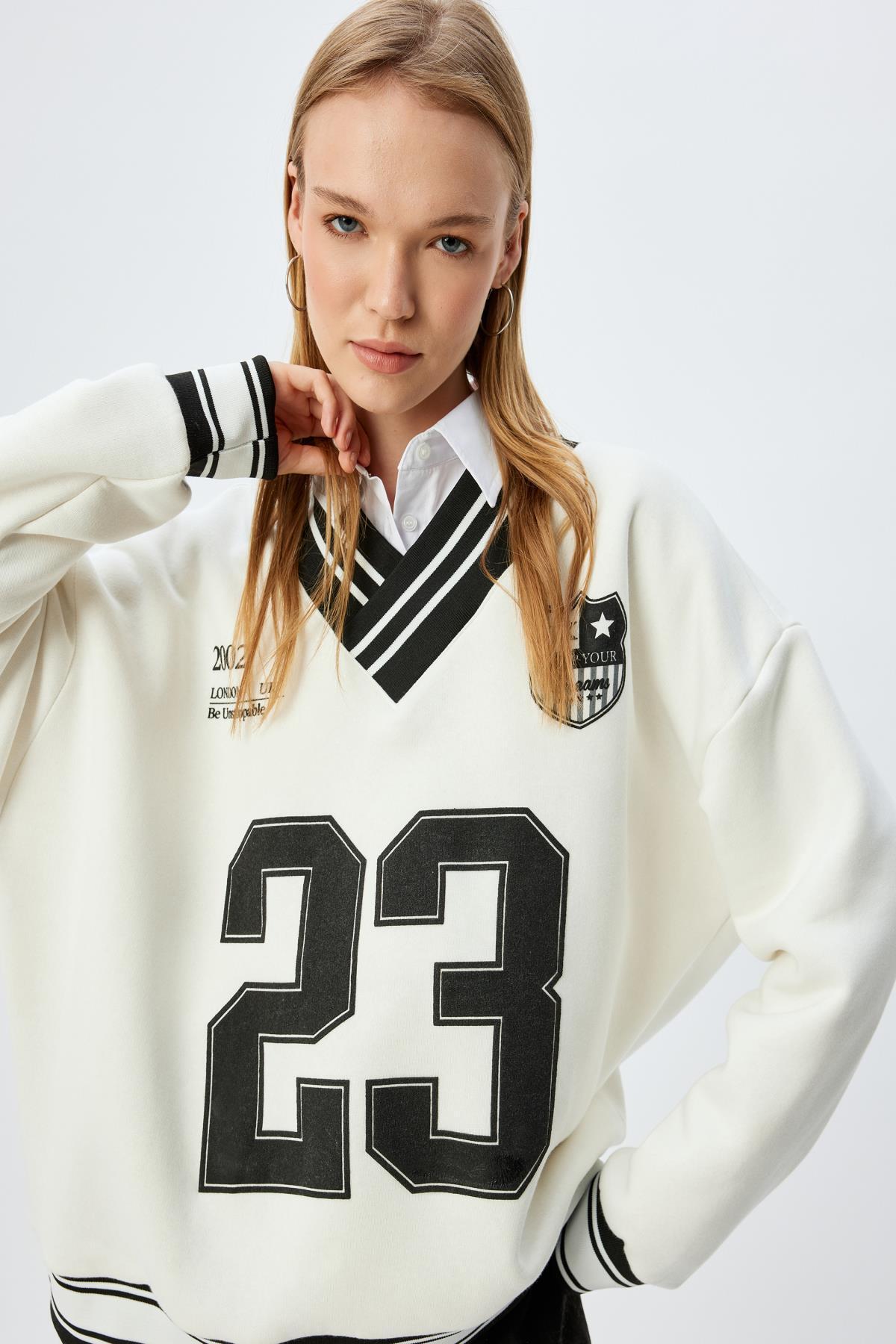 Kolej Baskılı V Yaka Uzun Kollu Oversize Sweatshirt Kolej Baskılı V Yaka Uzun Kollu Oversize Sweatshirt 5SAL10419IK XL