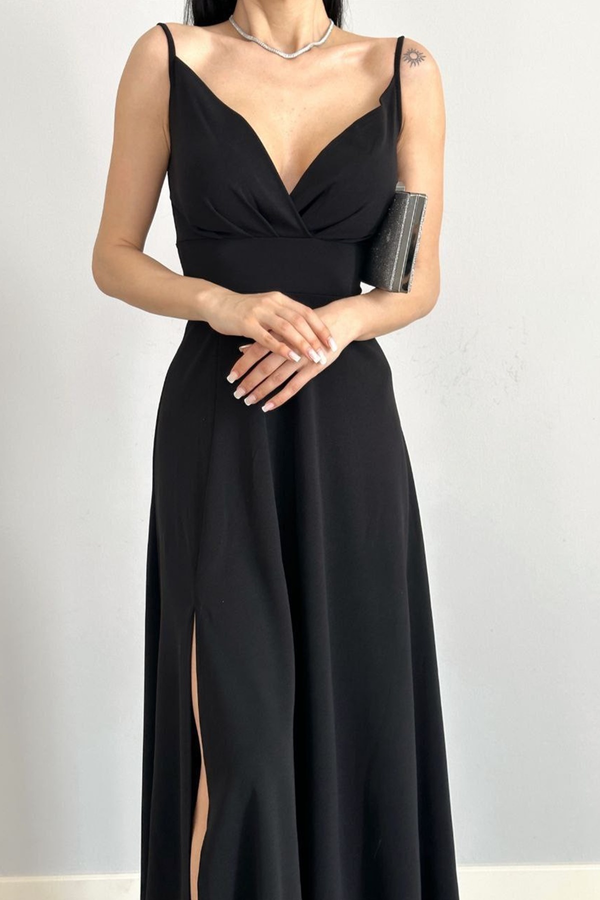 Siyah Esnek Krep Kumaş Kruvaze Yaka Yırtmaç Detay Askılı Maxi Elbise 582189 Siyah Esnek Krep Kumaş Kruvaze Yaka Yırtmaç Detay Askılı Maxi Elbise 582189 4S1B-EMR-582189 L