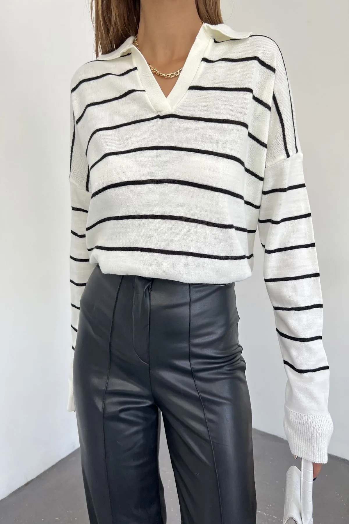 Kadın Polo Yaka Çizgili Triko Kazak Beyaz Kadın Polo Yaka Çizgili Triko Kazak Beyaz beyazoglu002-21 Standart