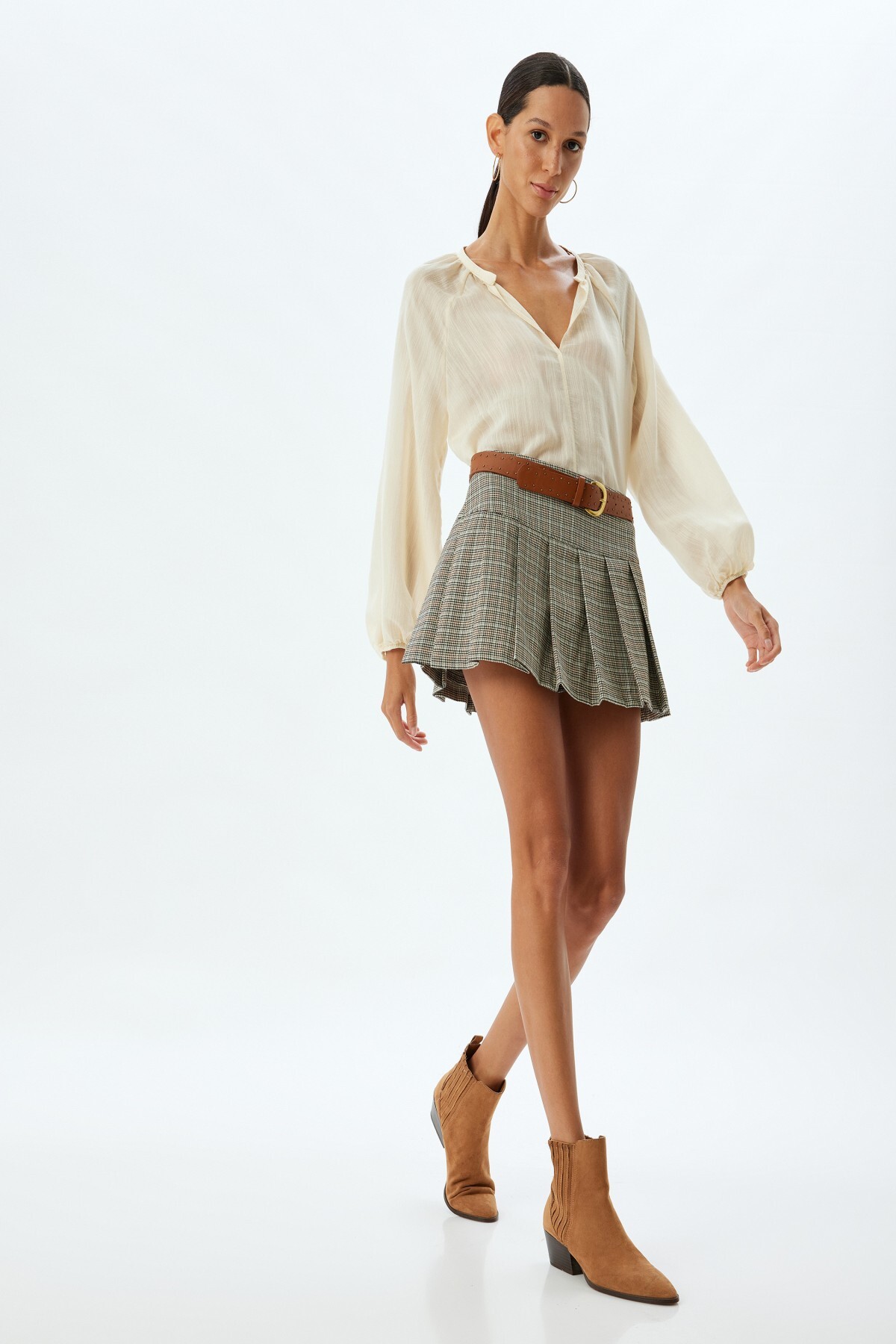 Kadın Gri Ekoseli İçi Astarlı Şortlu Kemerli Pileli Mini Şort Etek Kadın Gri Ekoseli İçi Astarlı Şortlu Kemerli Pileli Mini Şort Etek ASF1-ET502 L