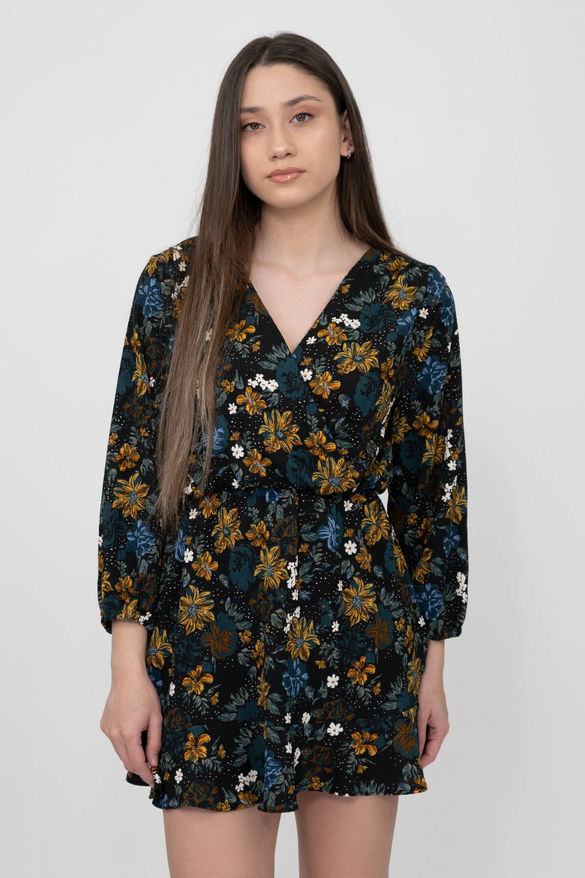 Drapeli, Kalp Yaka, Balon Kol, Çiçek Desenli Mini Elbise Drapeli, Kalp Yaka, Balon Kol, Çiçek Desenli Mini Elbise ERA-2250 XL