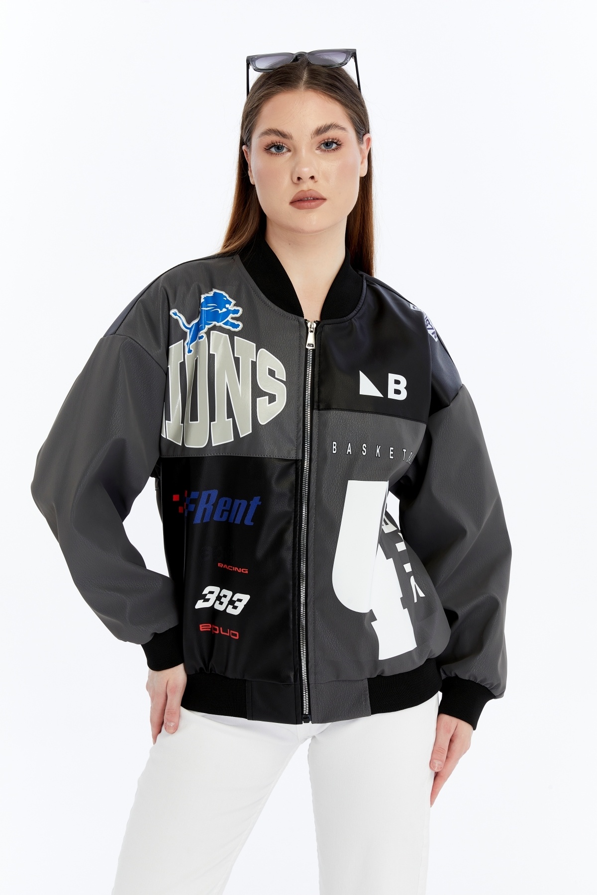 Kadın Oversize Baskılı Deri Motorcu Montu Fermuarlı Yarışçı Ceket Astarlı Bomber Kolej Mont Kadın Oversize Baskılı Deri Motorcu Montu Fermuarlı Yarışçı Ceket Astarlı Bomber Kolej Mont 38016-3 L