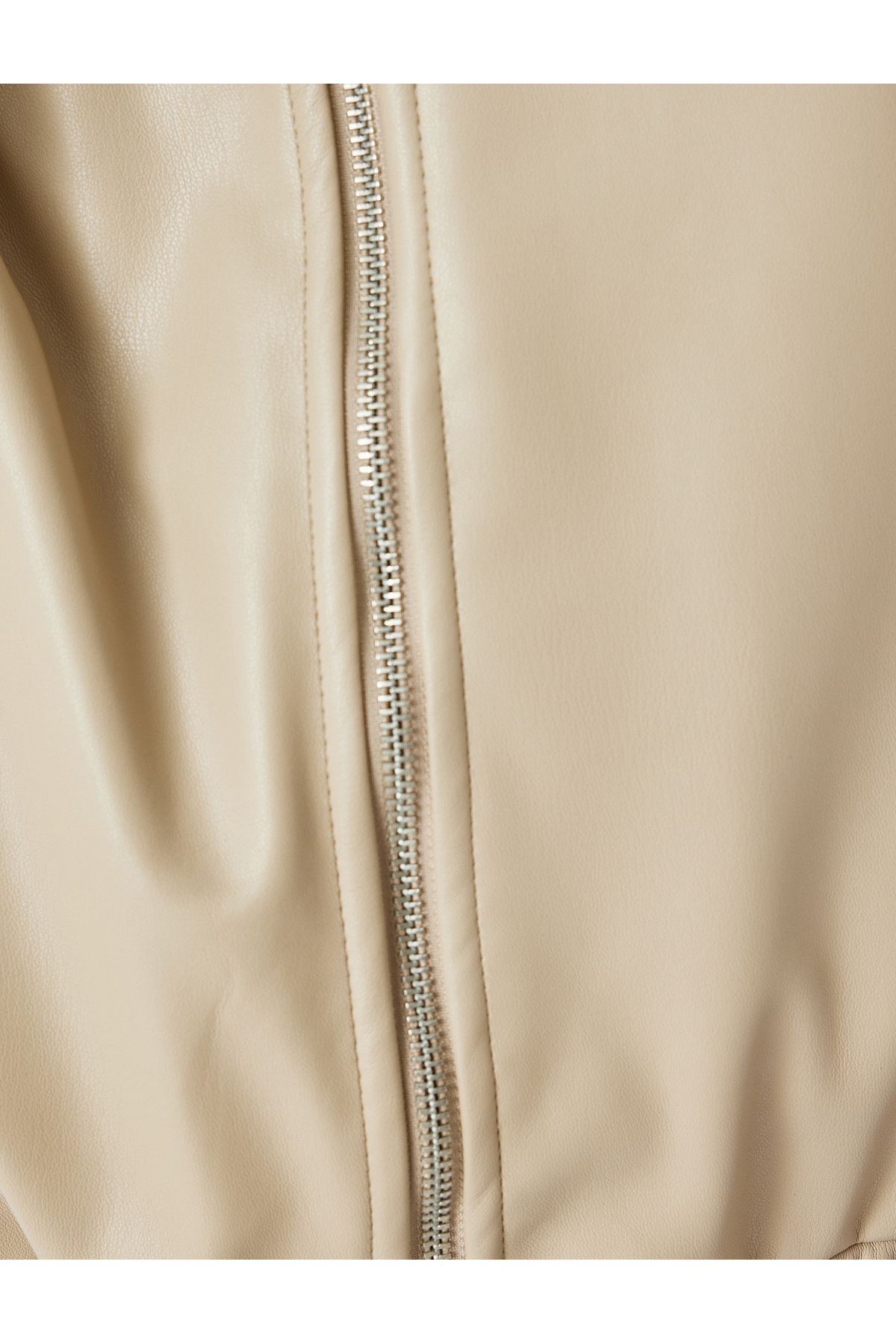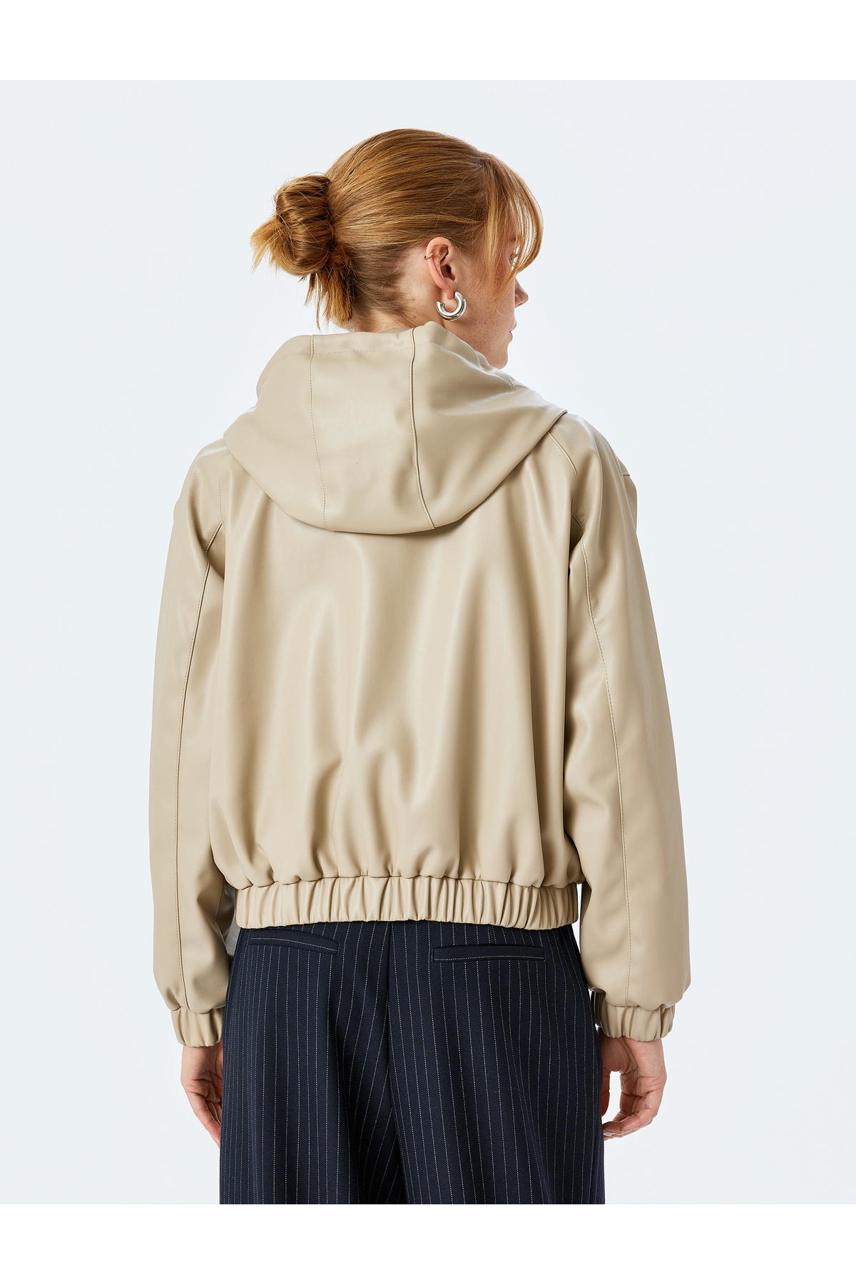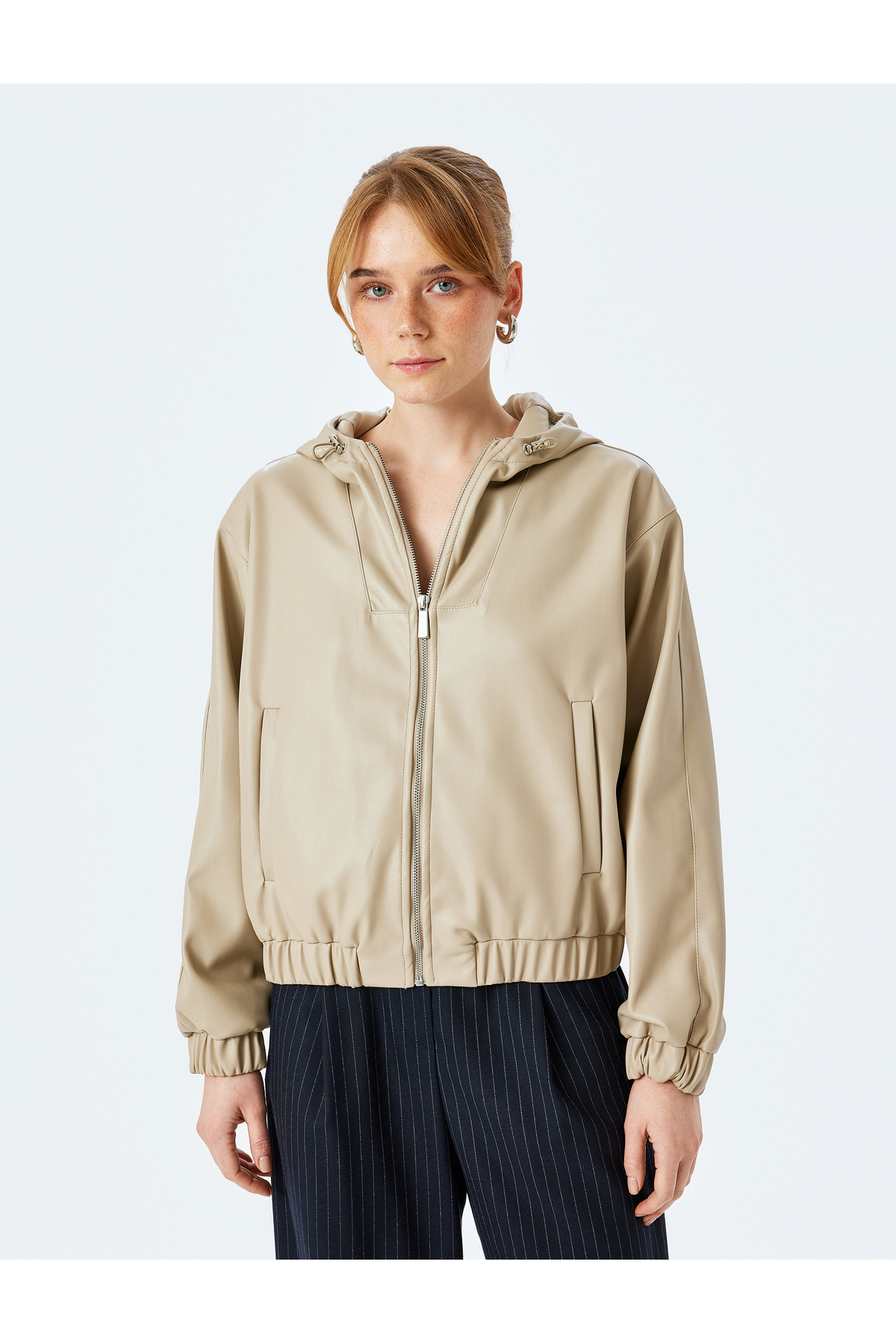Uzun Kollu Fermuarlı Kapüşonlu Suni Deri Bomber Ceket Uzun Kollu Fermuarlı Kapüşonlu Suni Deri Bomber Ceket 5SAK20078EW 42