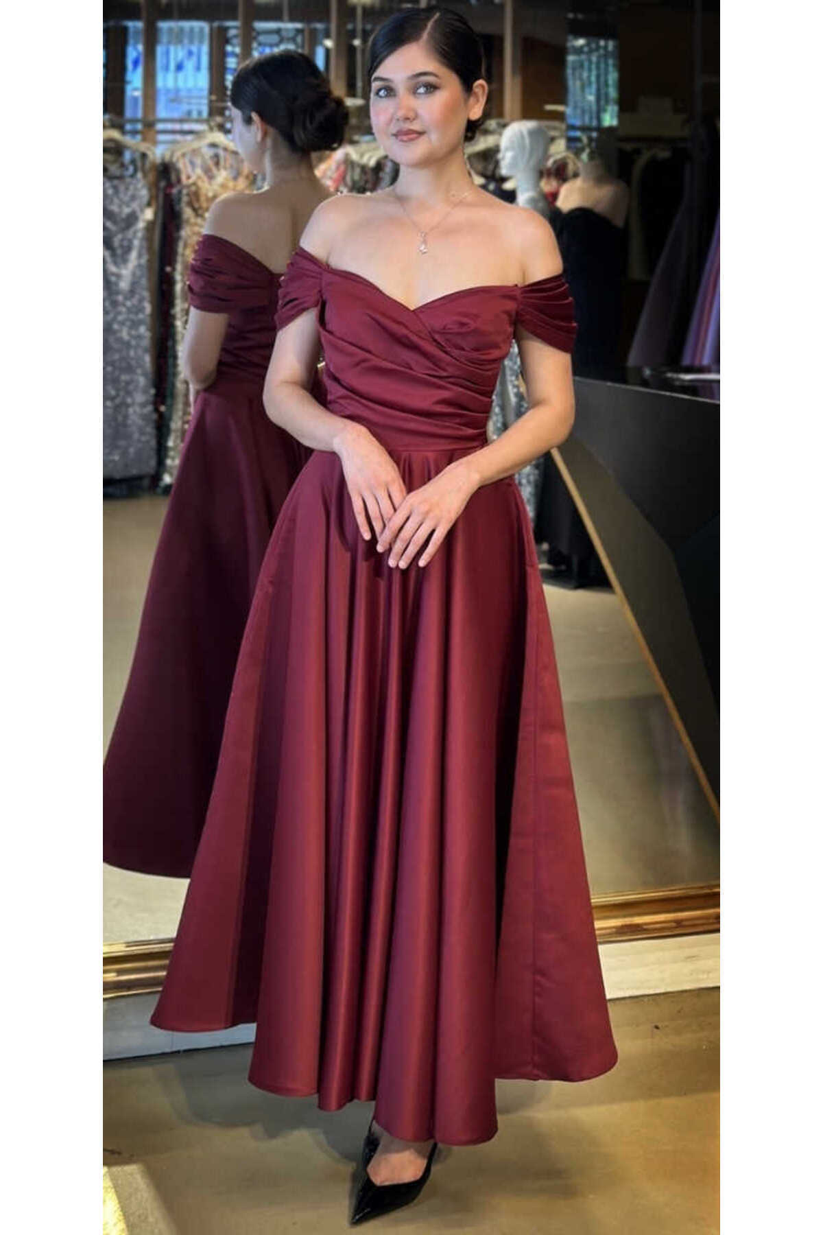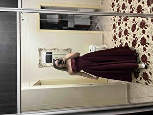 Vişne Renk Straplez Yaka Kloş Etekli Saten Midi Abiye Elbise 7647 Vişne Renk Straplez Yaka Kloş Etekli Saten Midi Abiye Elbise 7647 48