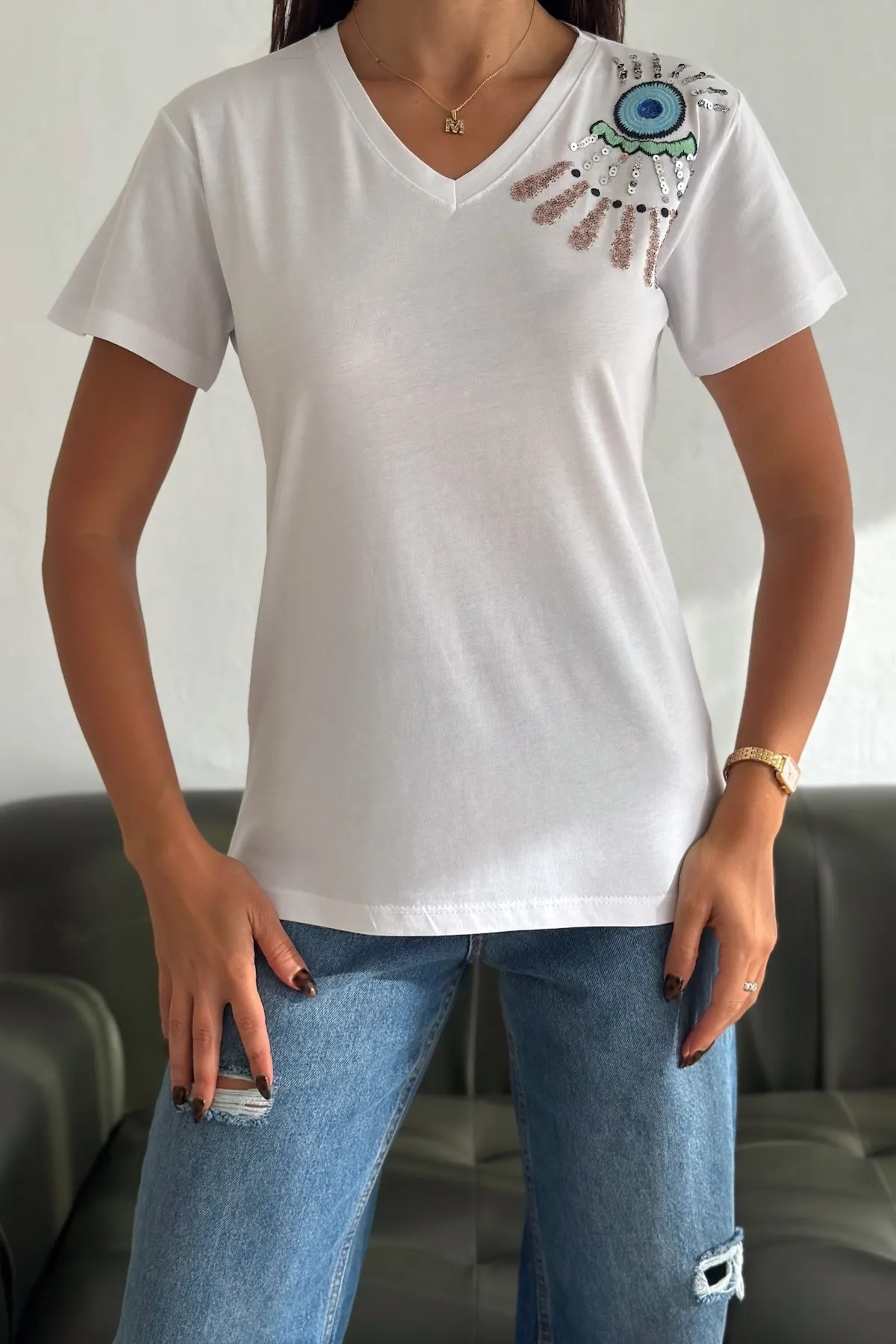 Kadın Beyaz V Yaka Omzu Nakış Ve Pul Payet İşlemeli %100 Pamuk T-Shirt Kadın Beyaz V Yaka Omzu Nakış Ve Pul Payet İşlemeli %100 Pamuk T-Shirt PulPayetTişört L