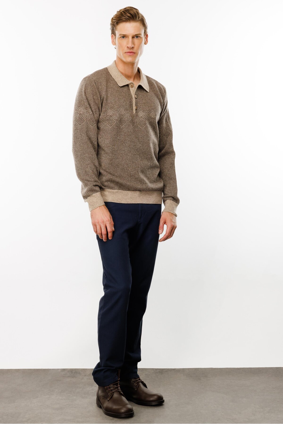 Erkek Polo Yaka Göğsü Baklava Desenli Yün Kazak K.Bej Erkek Polo Yaka Göğsü Baklava Desenli Yün Kazak K.Bej 24520 2XL