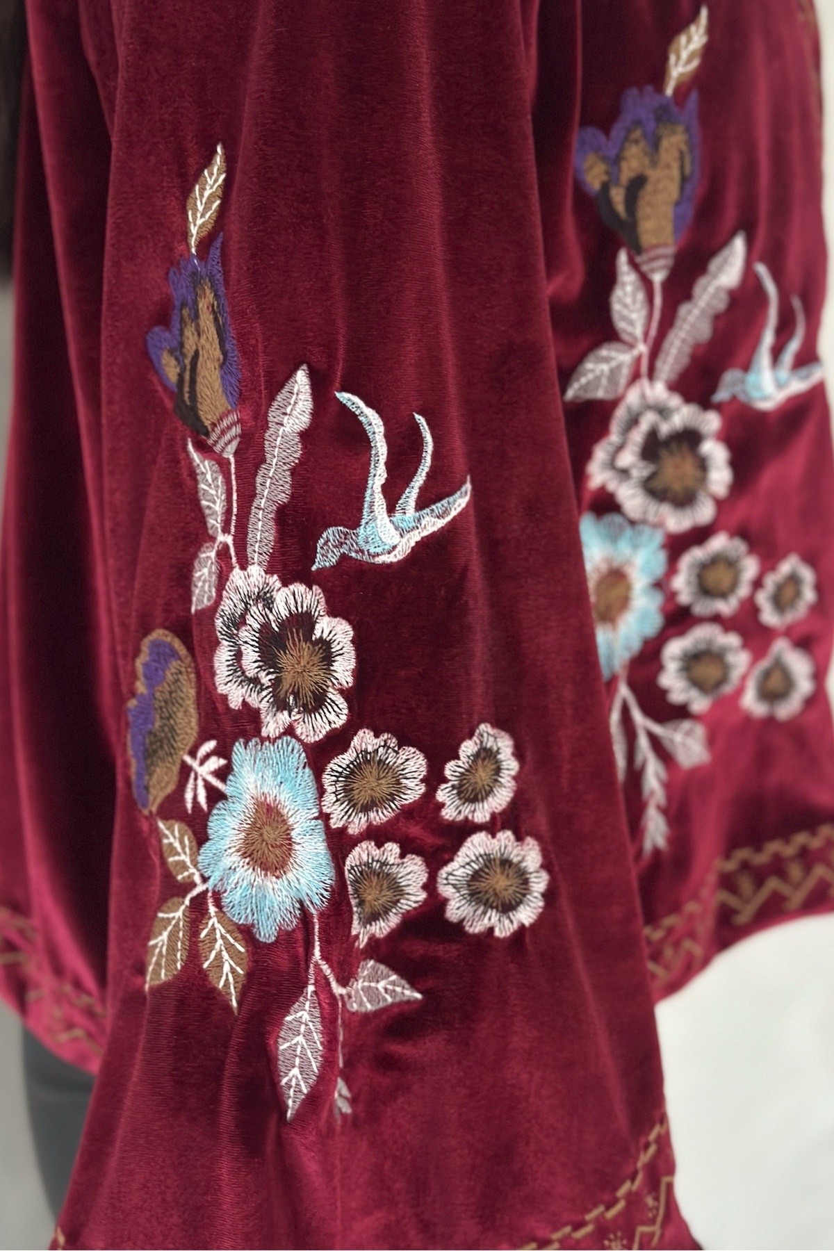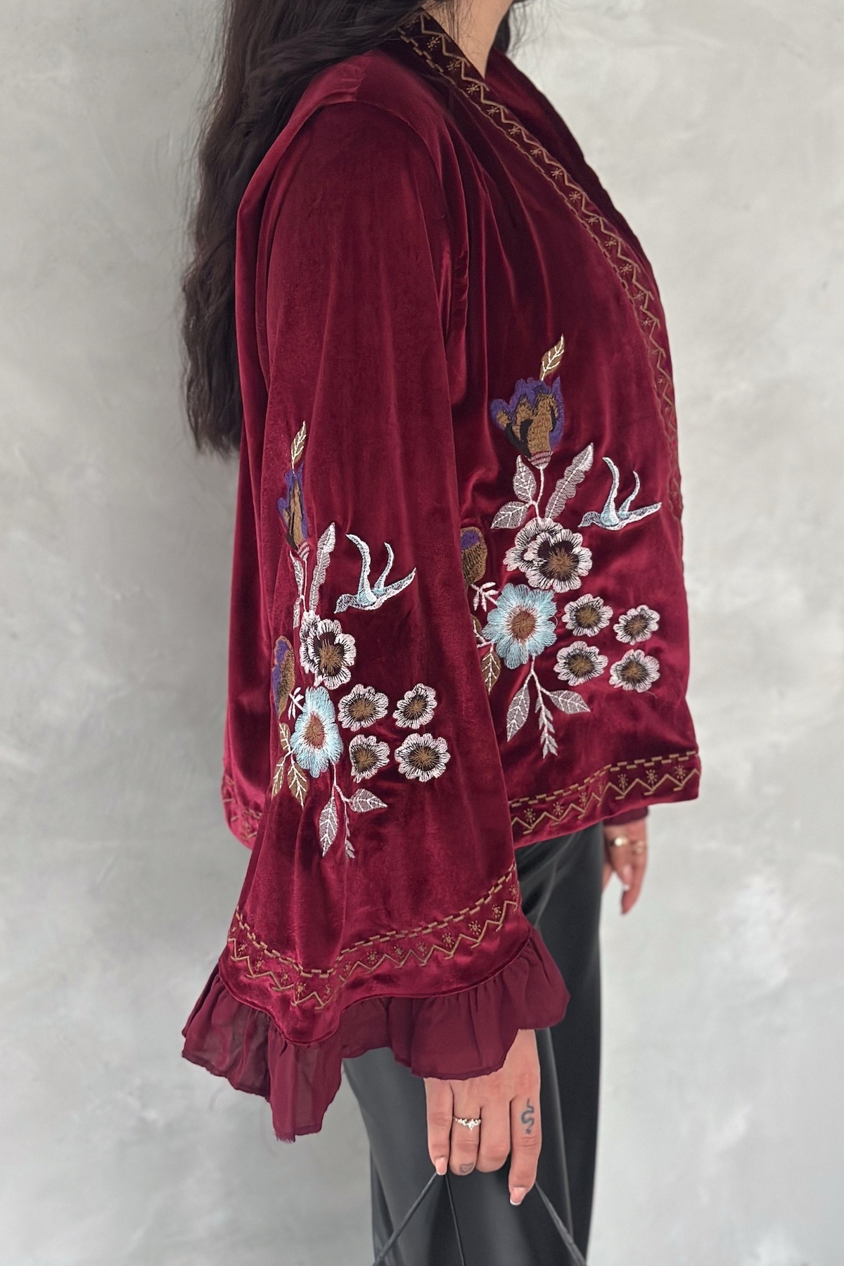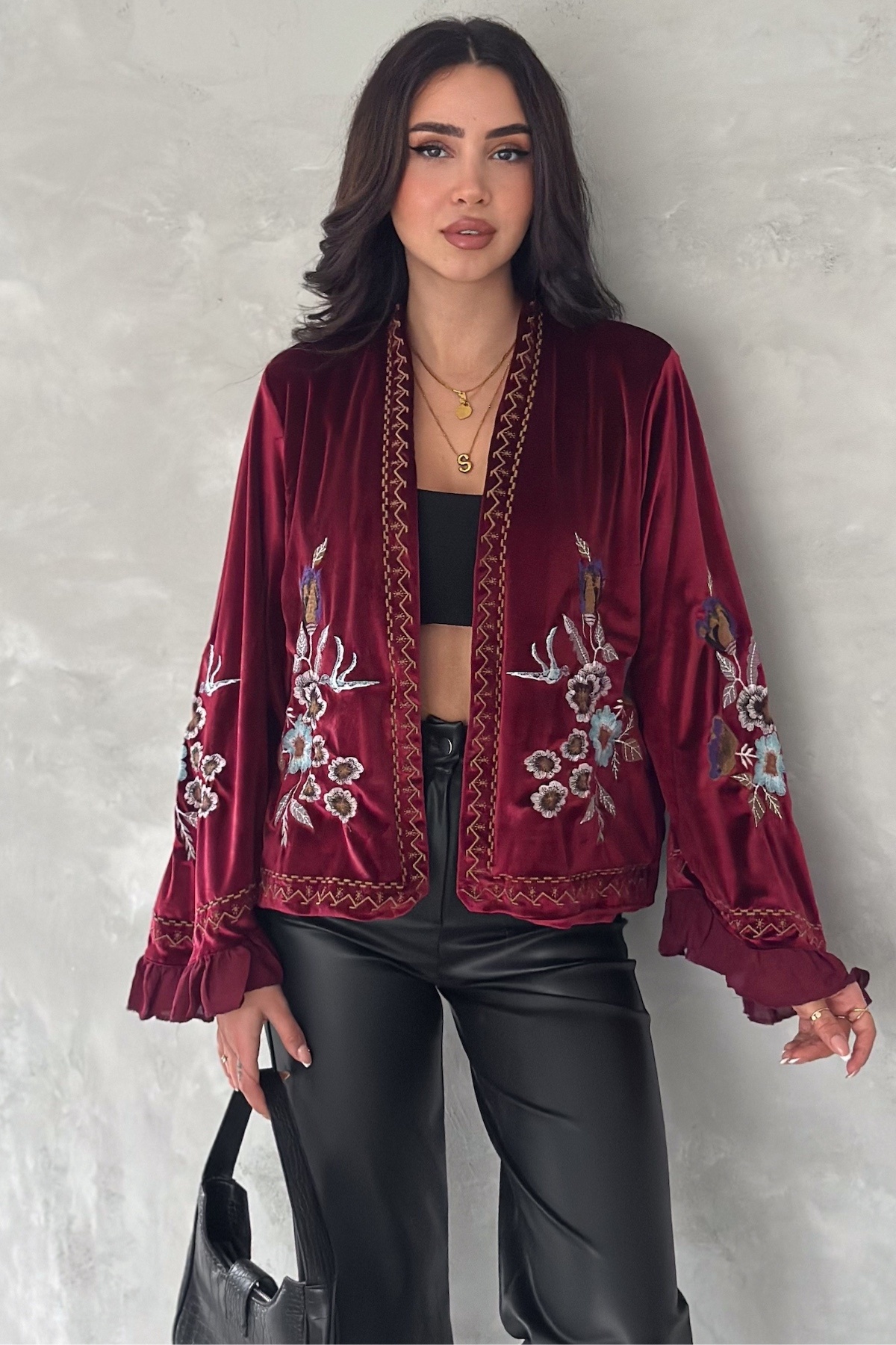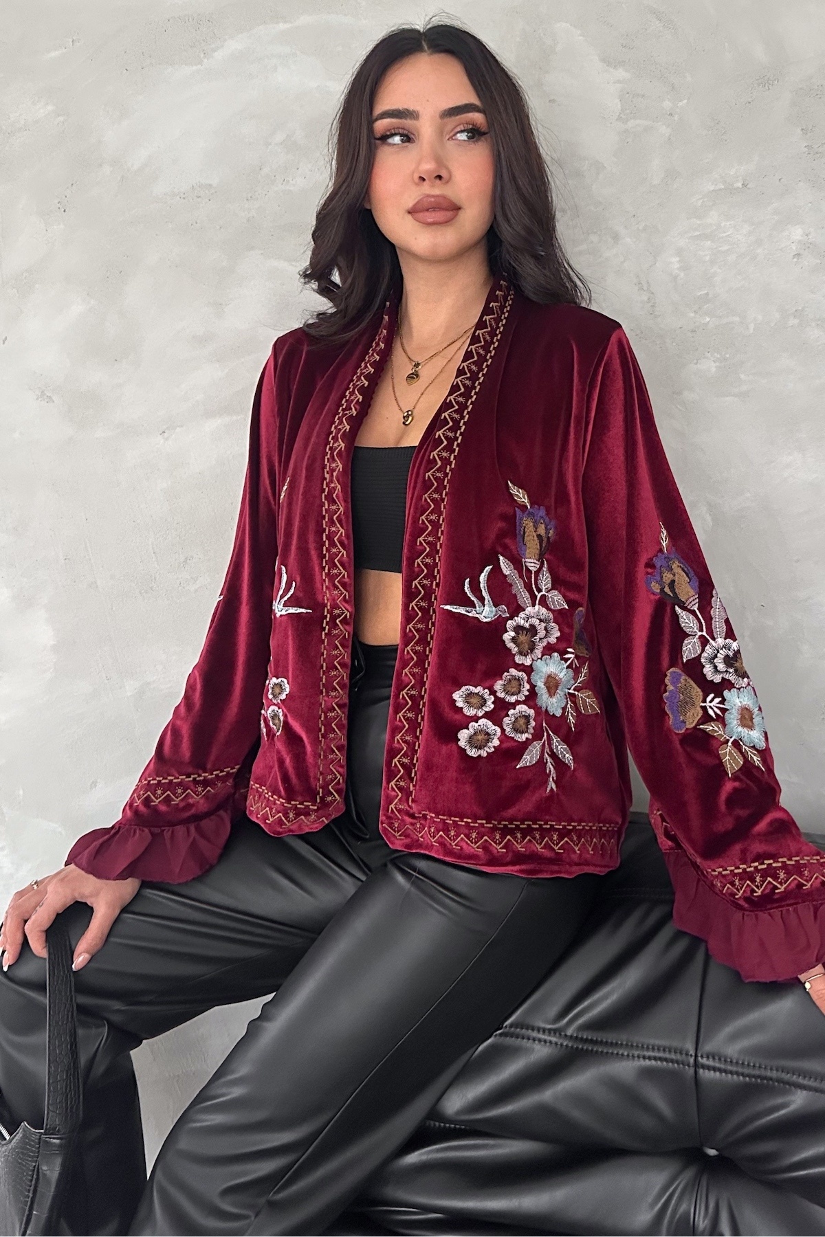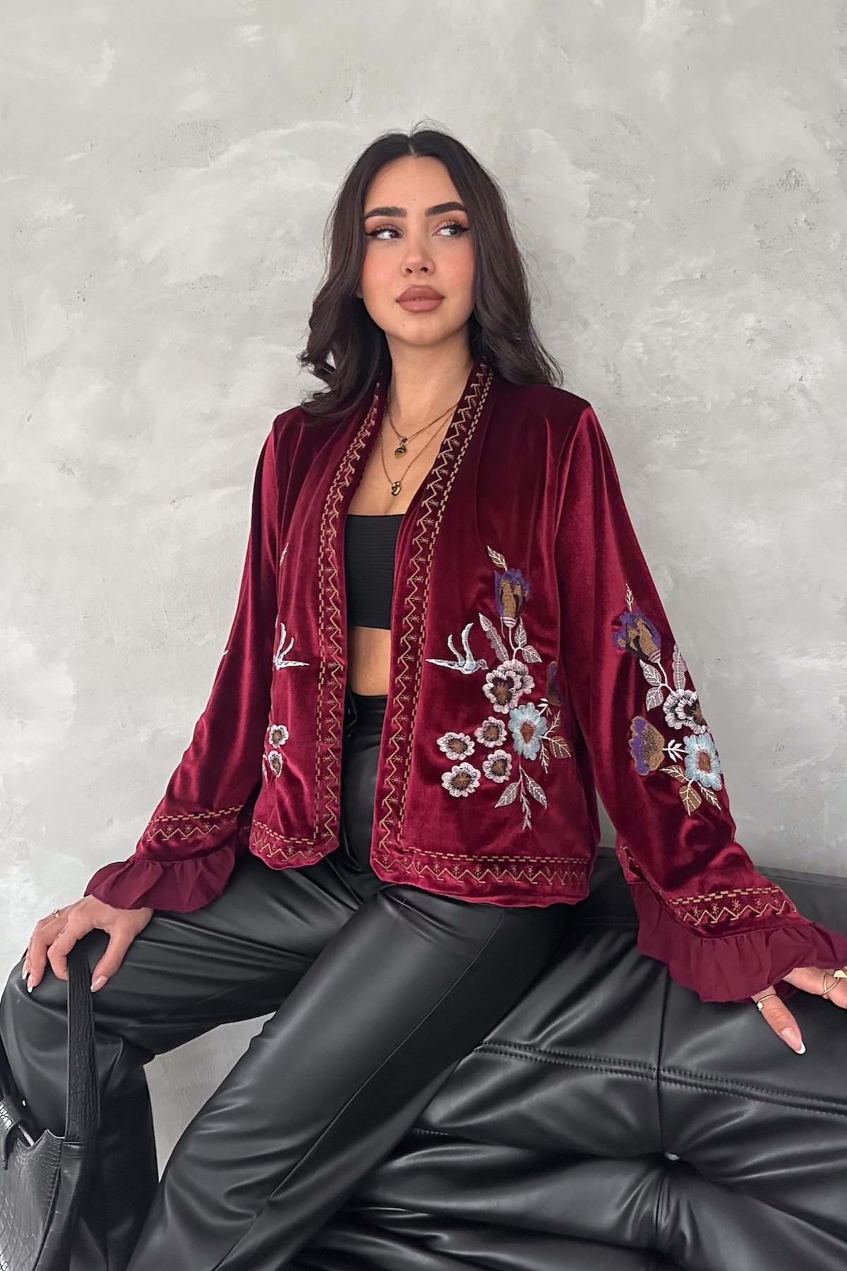Kadın Bordo Nakışlı İşlemeli Kadife Kimono Ceket Kadın Bordo Nakışlı İşlemeli Kadife Kimono Ceket 5577 L