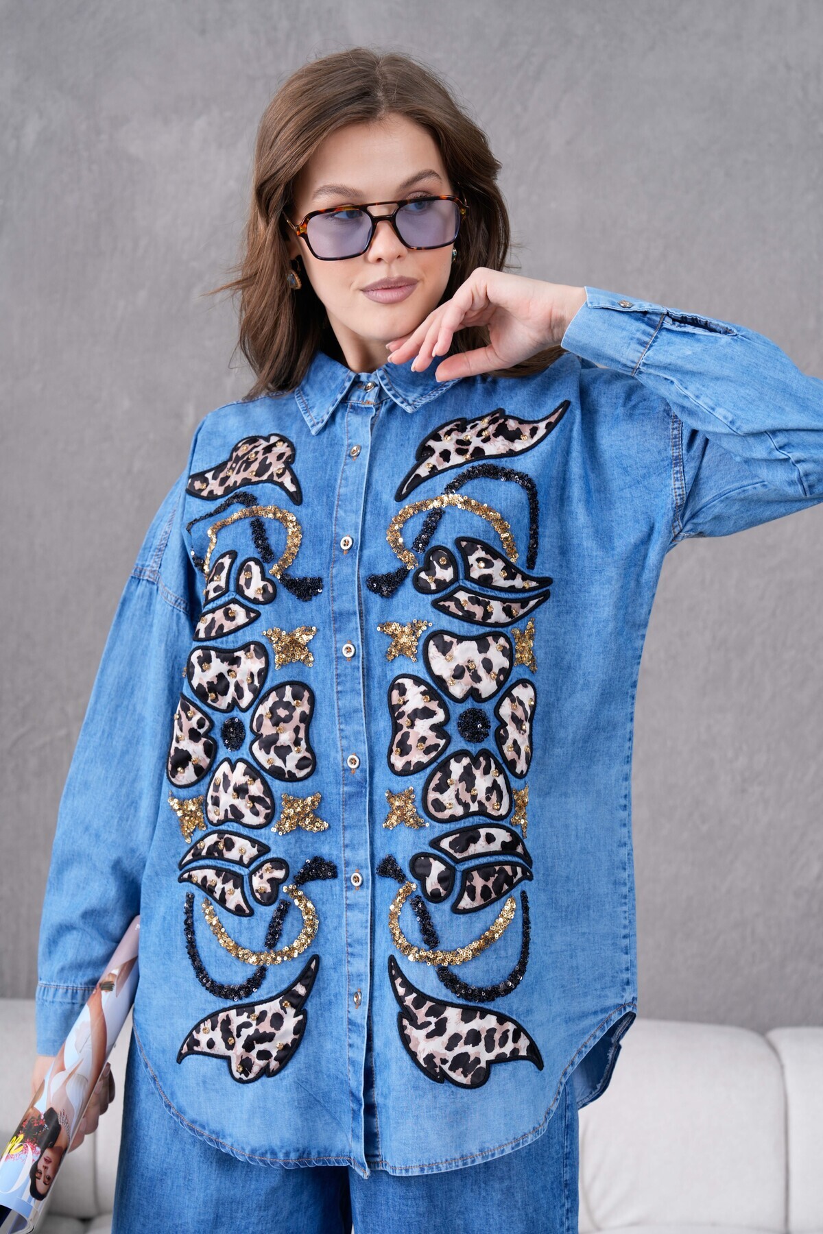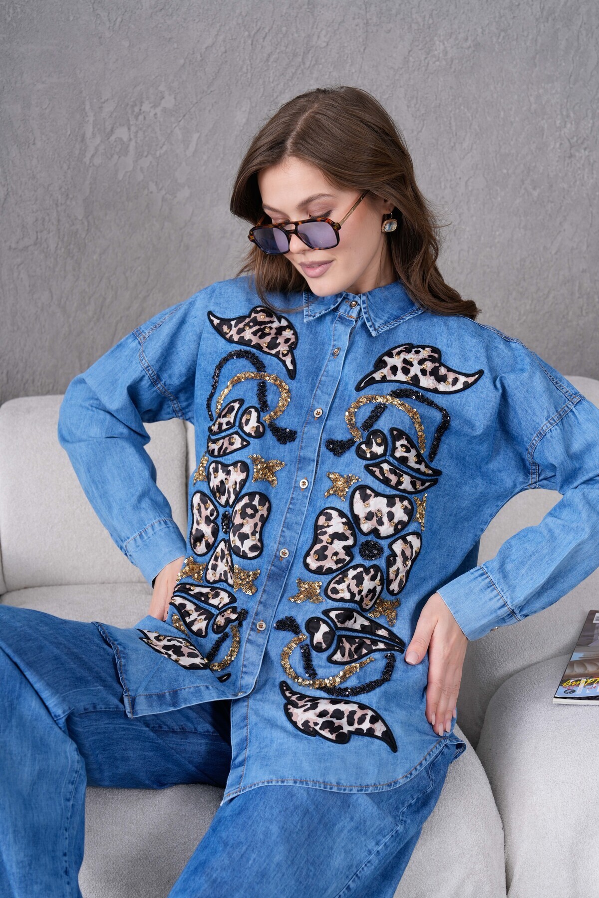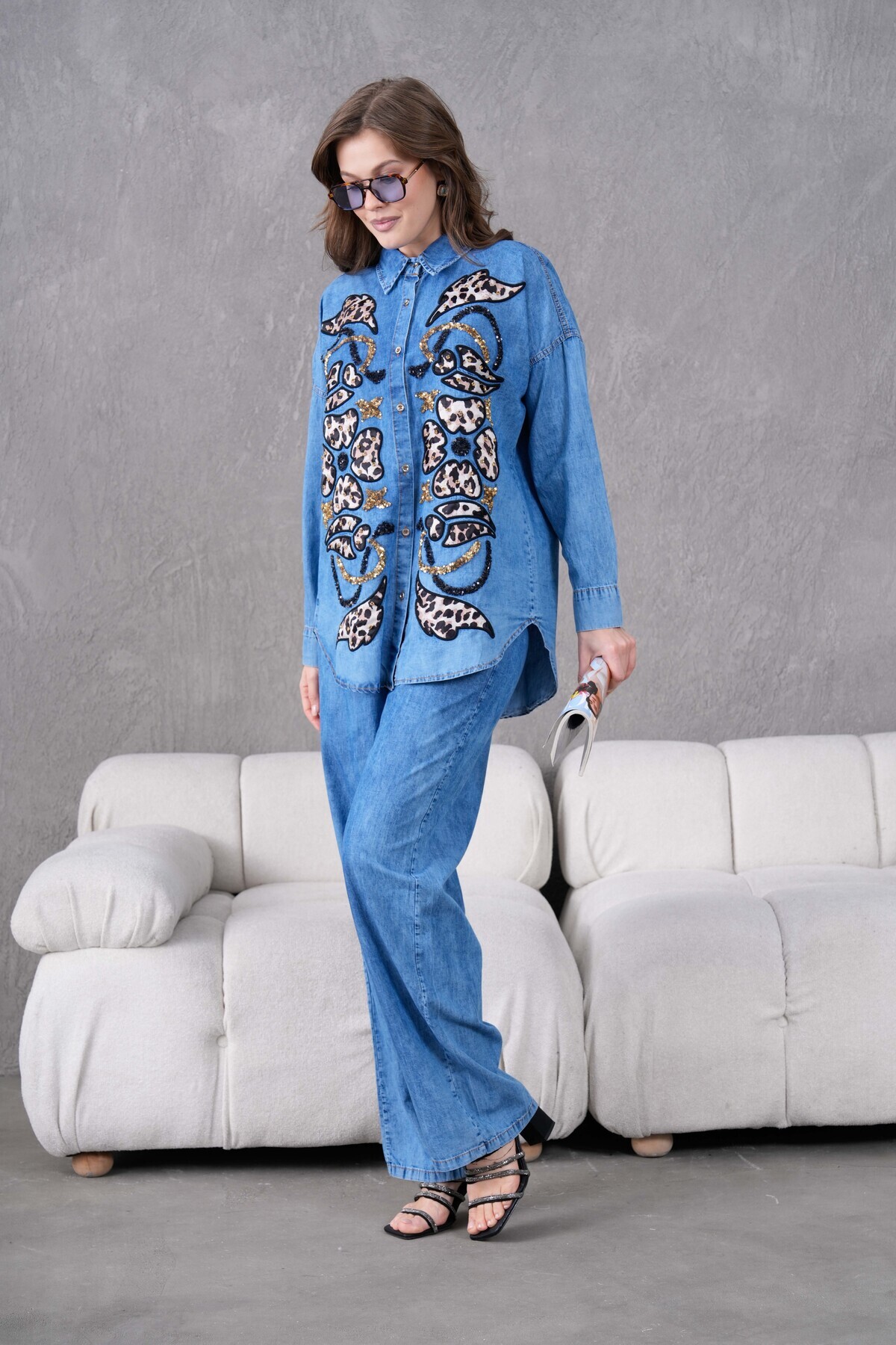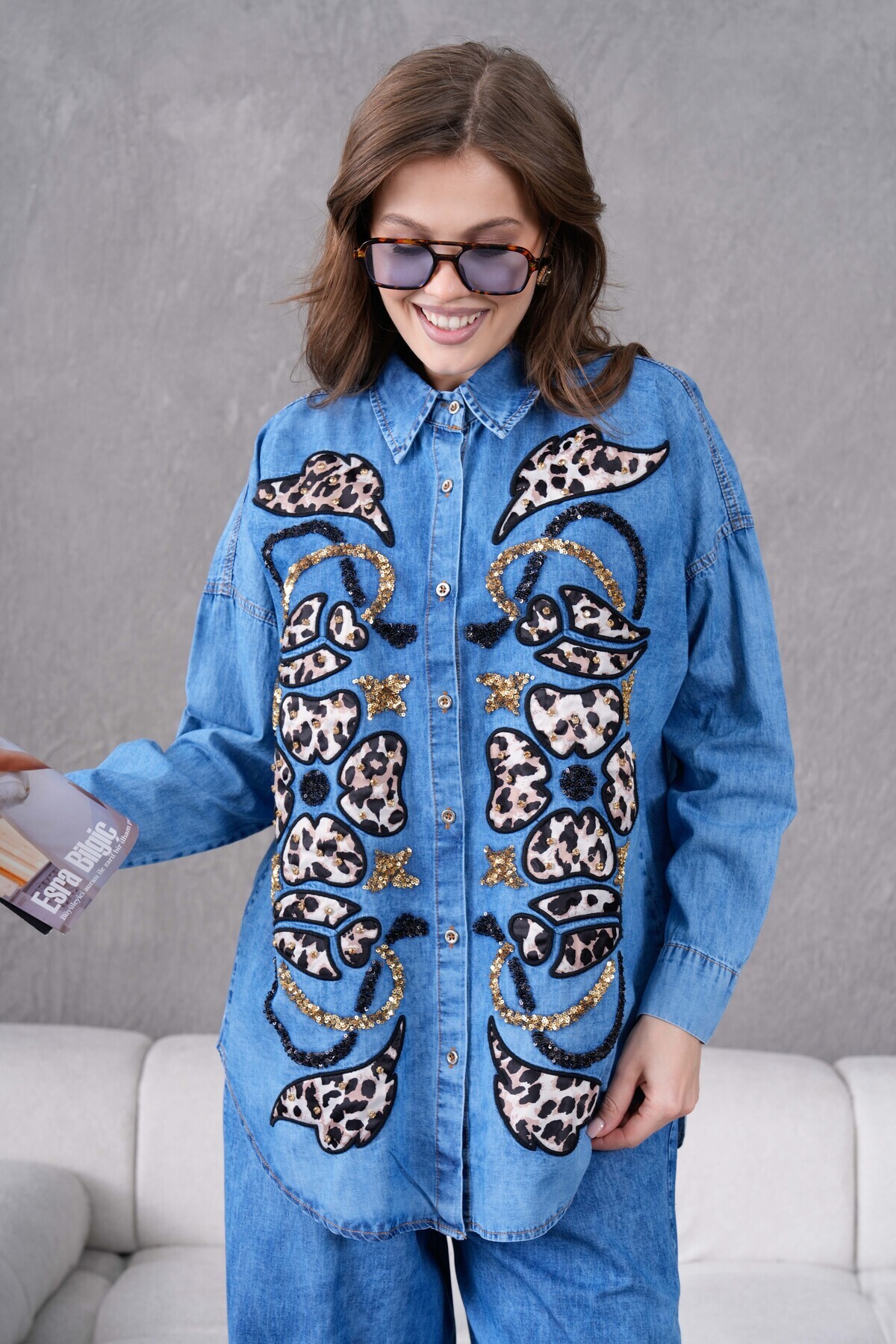 Kadın Önü Pul Payet Nakışlı Leopar Desenli Kot Gömlek Ve Kot Pantolon Alt Üst Takım Kadın Önü Pul Payet Nakışlı Leopar Desenli Kot Gömlek Ve Kot Pantolon Alt Üst Takım 407D XL