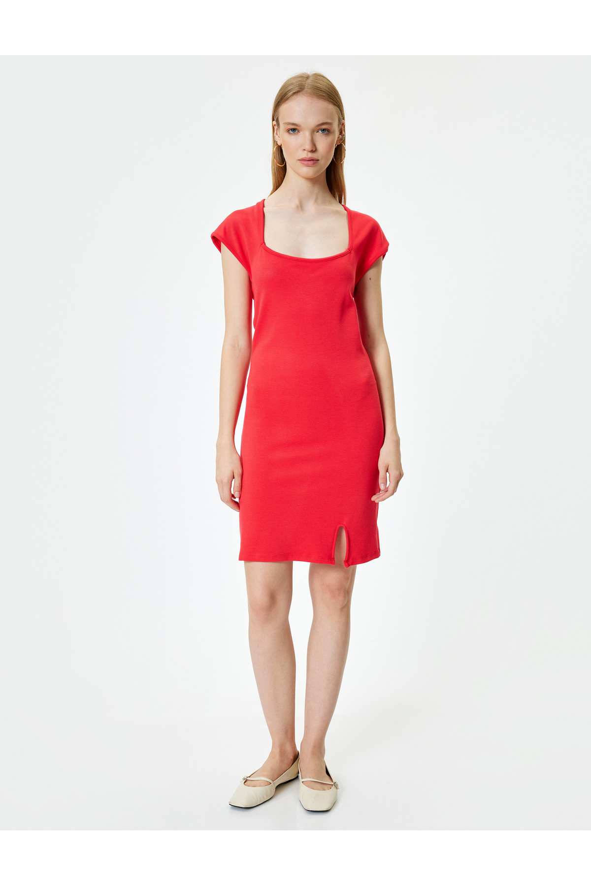 Kısa Kollu Mini Elbise Yırtmaç Detaylı Kare Yaka Kısa Kollu Mini Elbise Yırtmaç Detaylı Kare Yaka 4SAL80187IK L