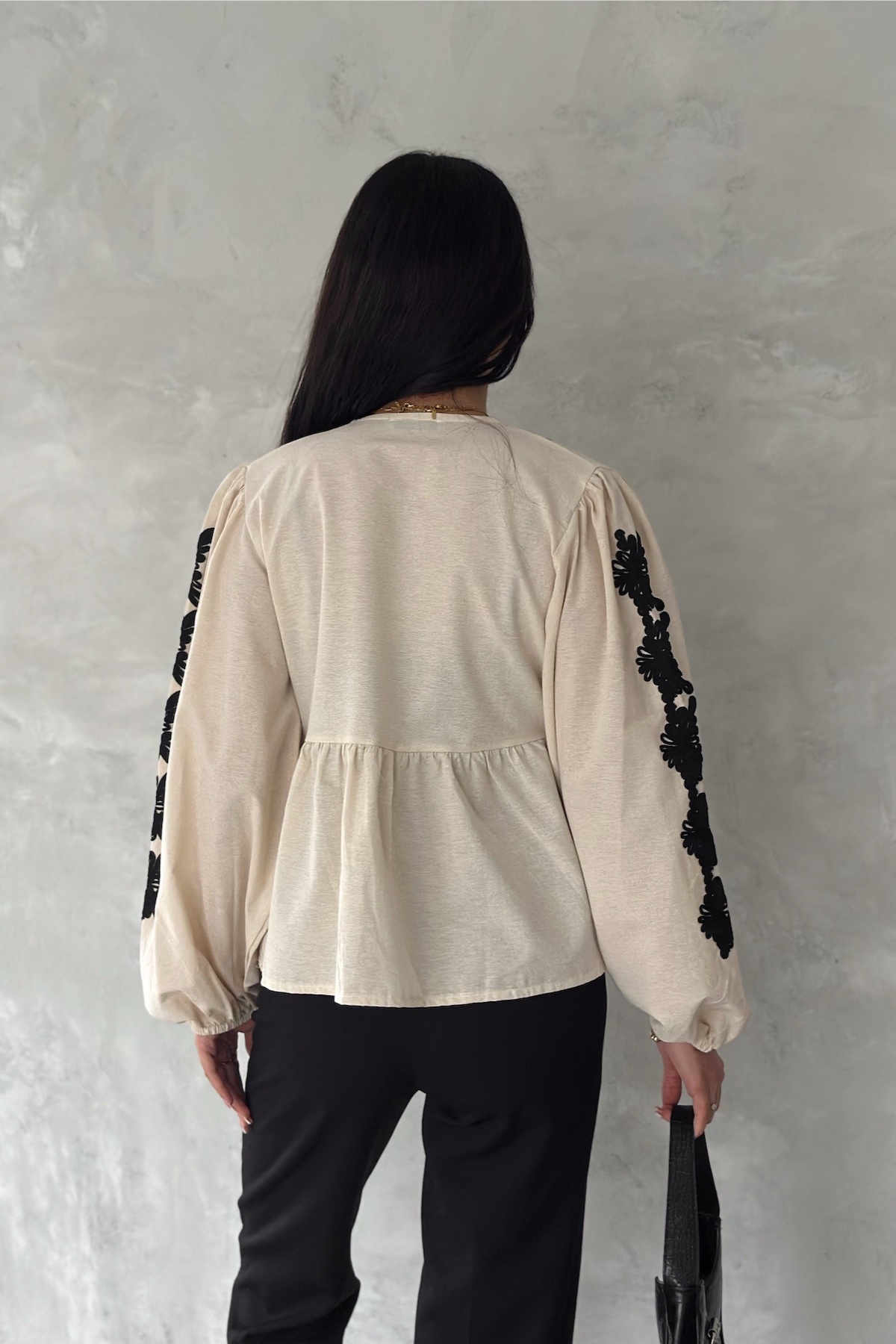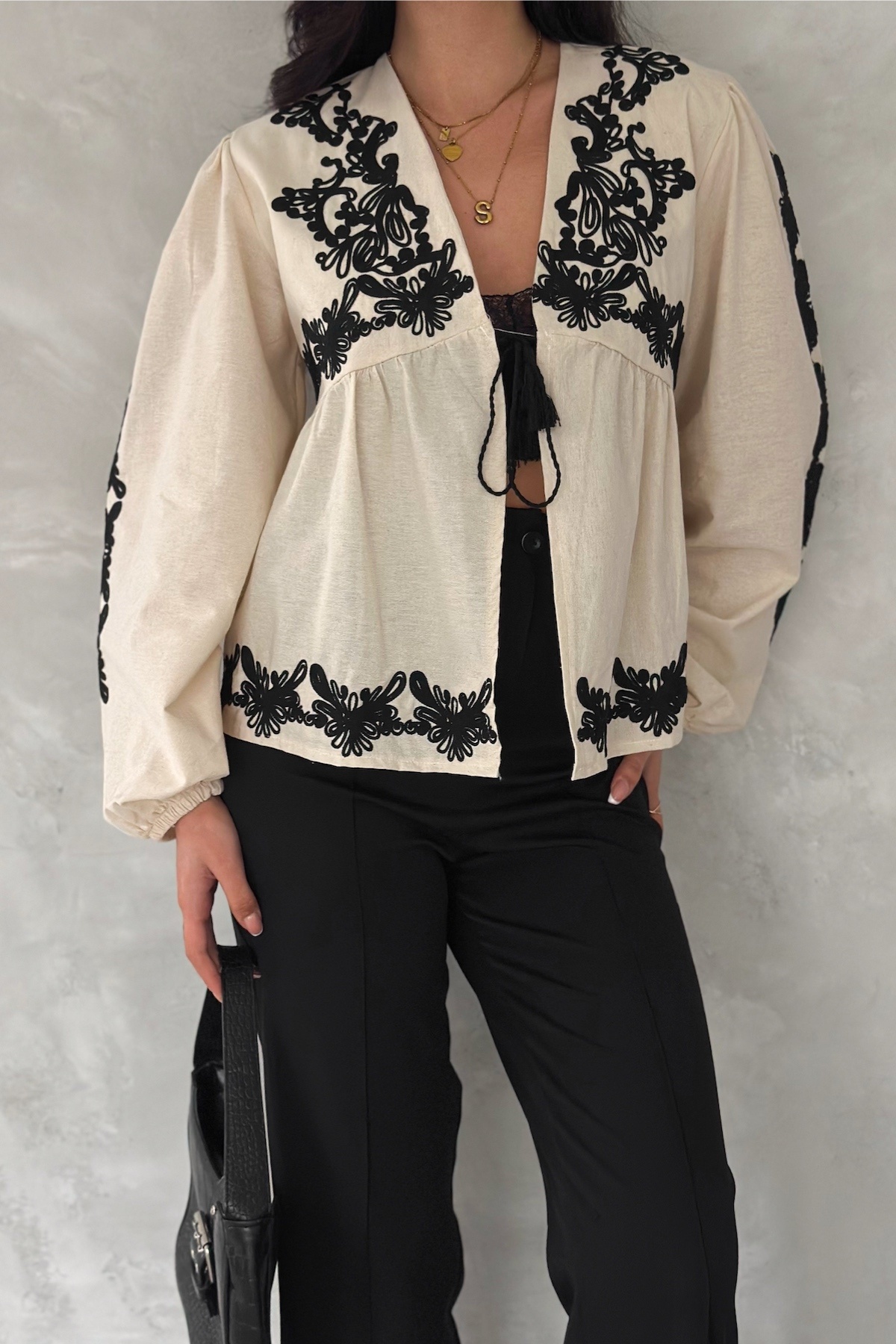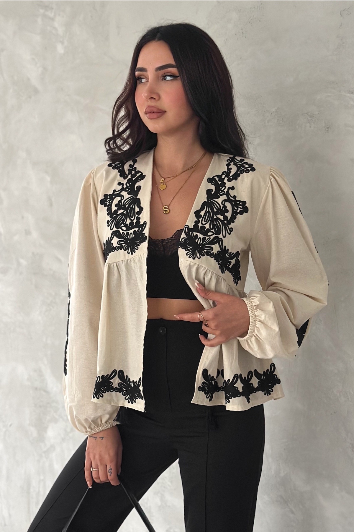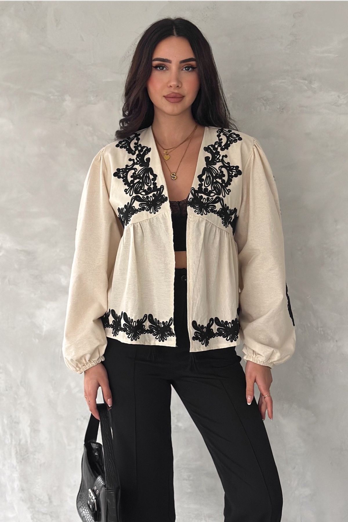 Kadın Bej Püsküllü Bağlamalı Komple Nakışlı Balon Kol İnce Ceket Kadın Bej Püsküllü Bağlamalı Komple Nakışlı Balon Kol İnce Ceket 5541 L