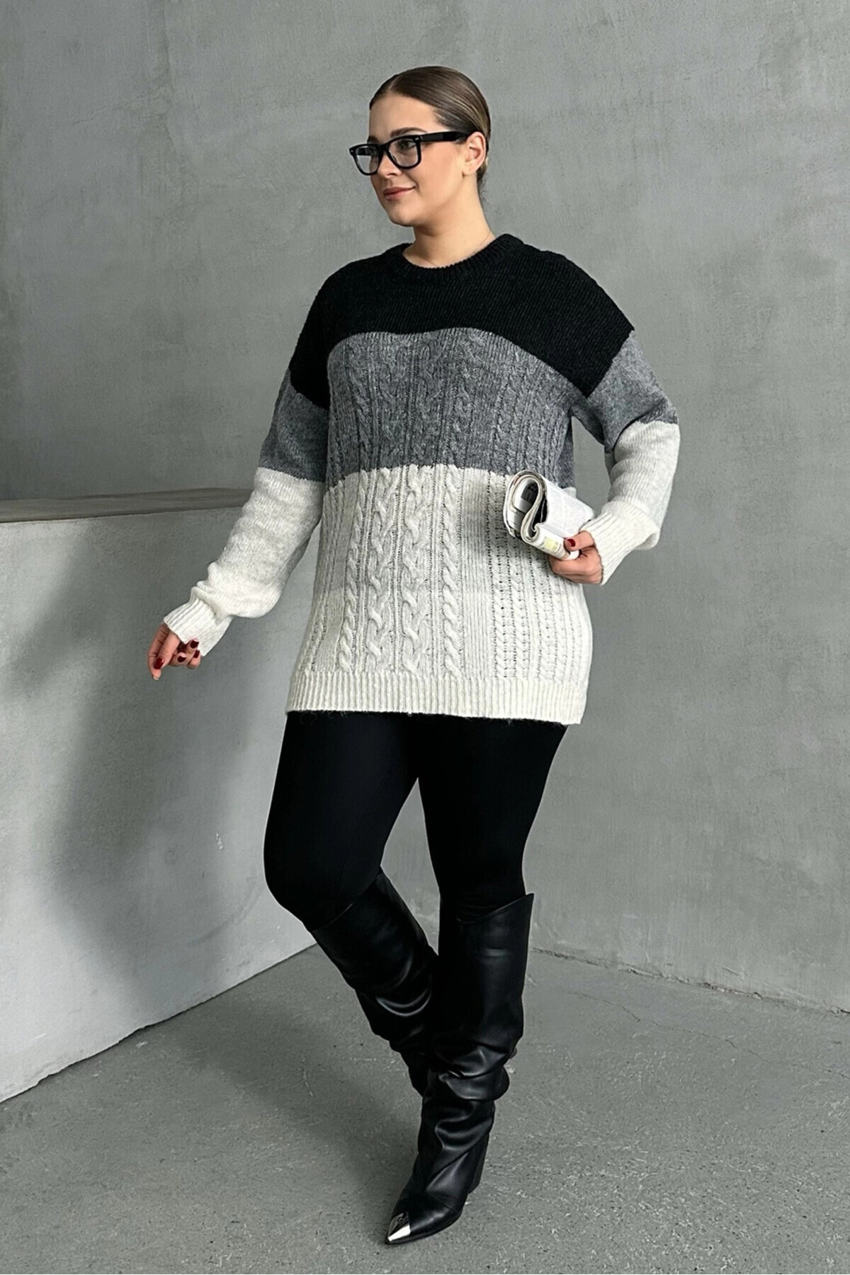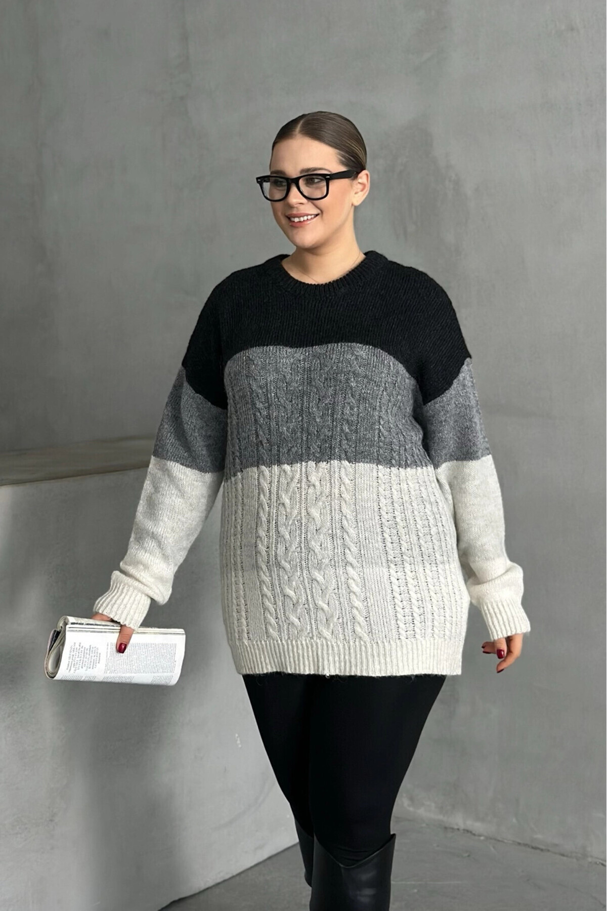 Büyük Beden Uzun Kollu Bisiklet Yaka Renk Bloklu Triko Kazak DG-04 Büyük Beden Uzun Kollu Bisiklet Yaka Renk Bloklu Triko Kazak DG-04 BYK-25K-DG04-GRI 54-56