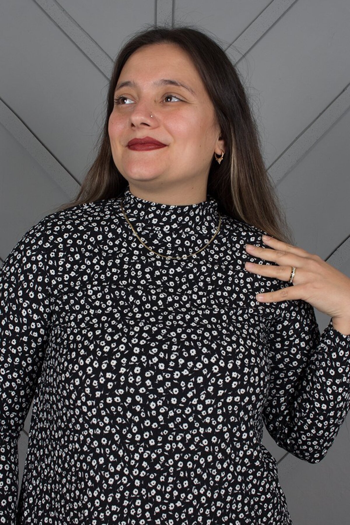 Büyük Beden Bürümcüklü Krep Çiçek Desenli Elbise Büyük Beden Bürümcüklü Krep Çiçek Desenli Elbise E625 52-54