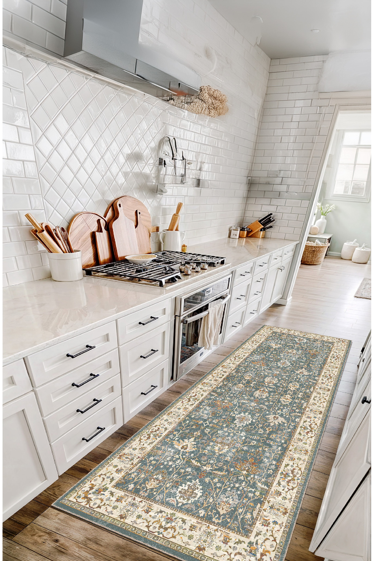 Mavi ve Yeşil Tonlarda Geleneksel Desenli Dijital Şönil Halı - , Vintage Stil Mavi ve Yeşil Tonlarda Geleneksel Desenli Dijital Şönil Halı - , Vintage Stil BIG121 100 x 100