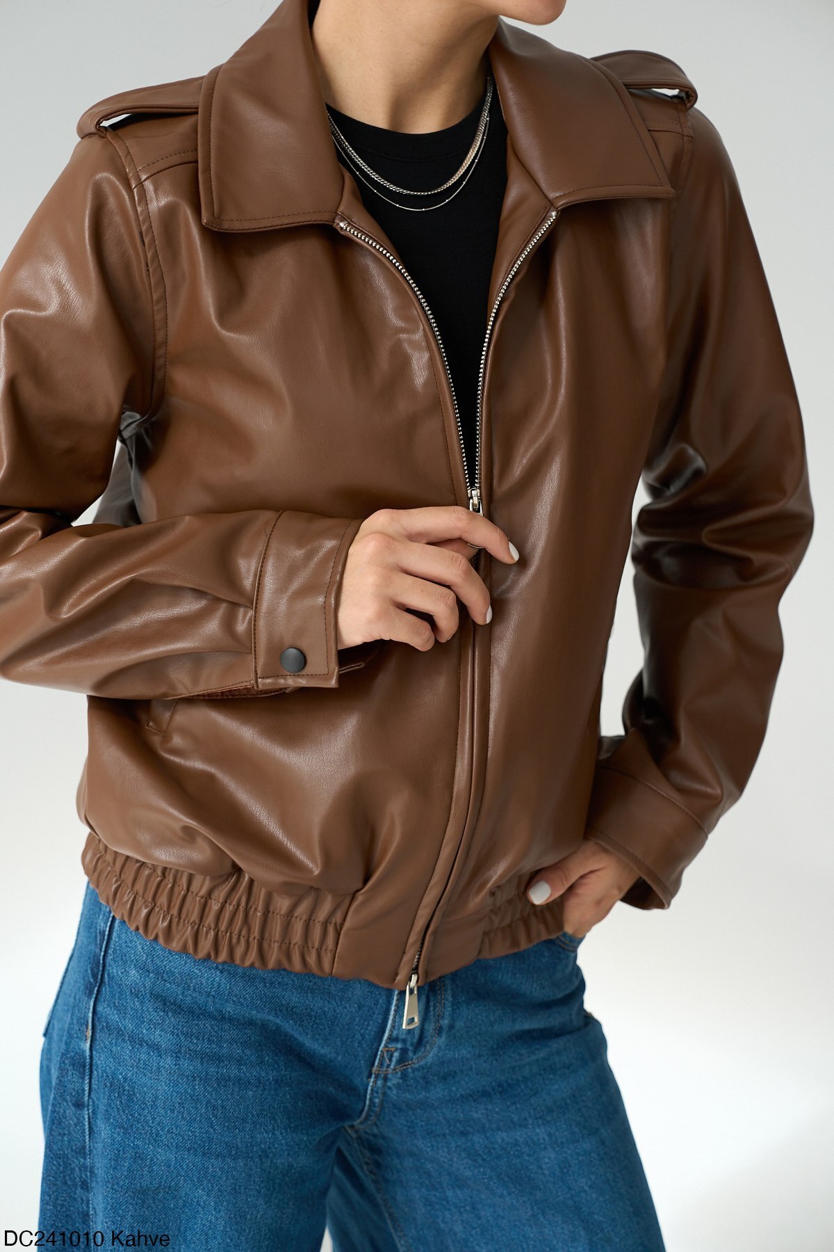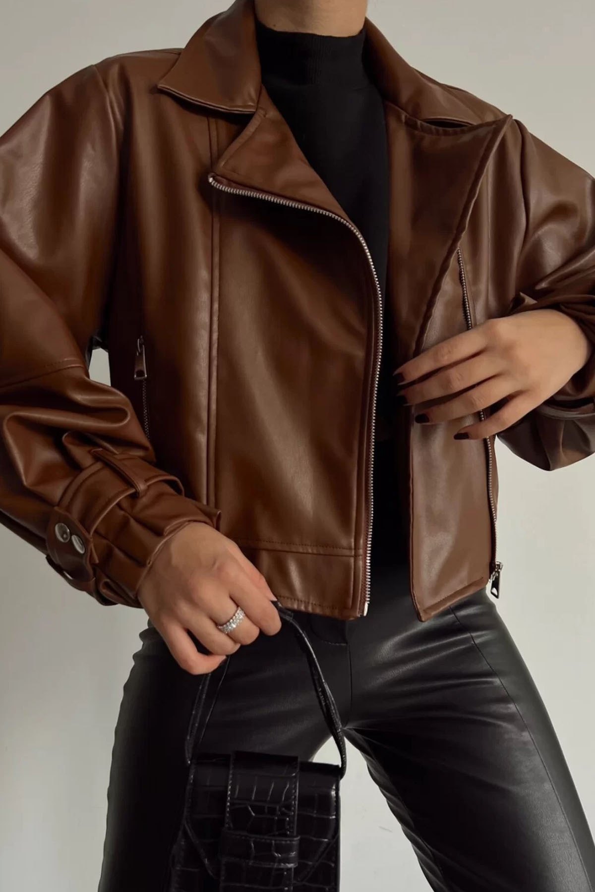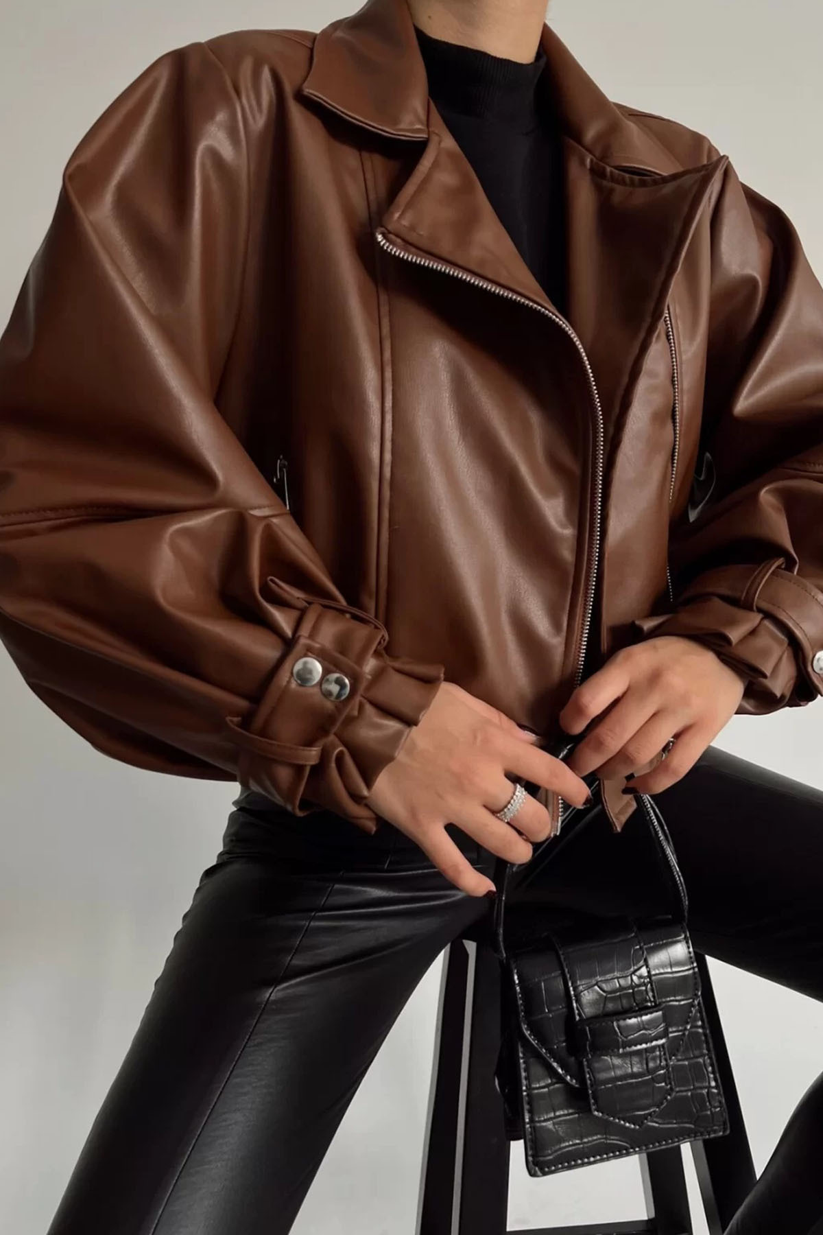 Kadın Siyah Oversize Deri Ceket- Kahverengi Kadın Siyah Oversize Deri Ceket- Kahverengi SWN0245 42