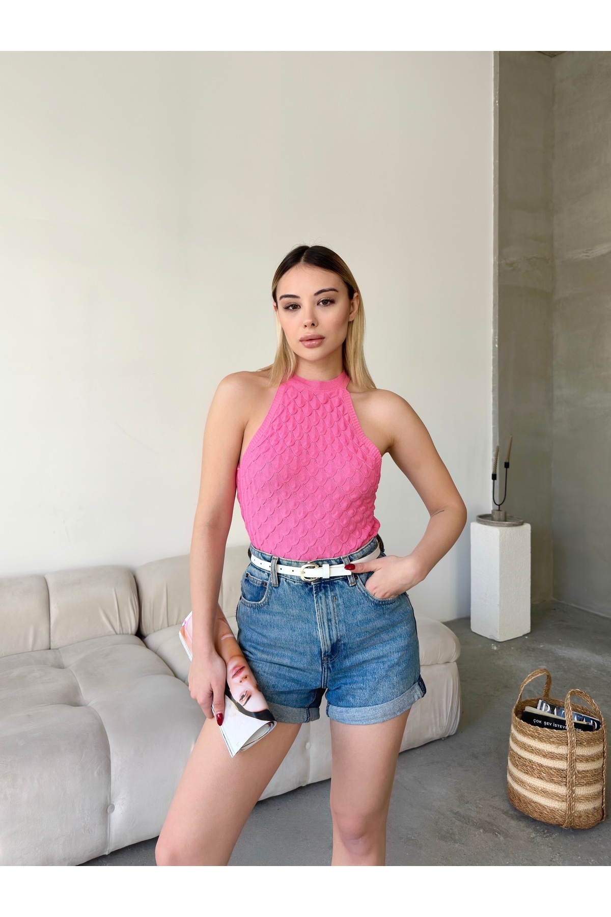 Halter Yaka Petek Desenli Dokulu Kolsuz Bluz Halter Yaka Petek Desenli Dokulu Kolsuz Bluz PRF-P3 Standart