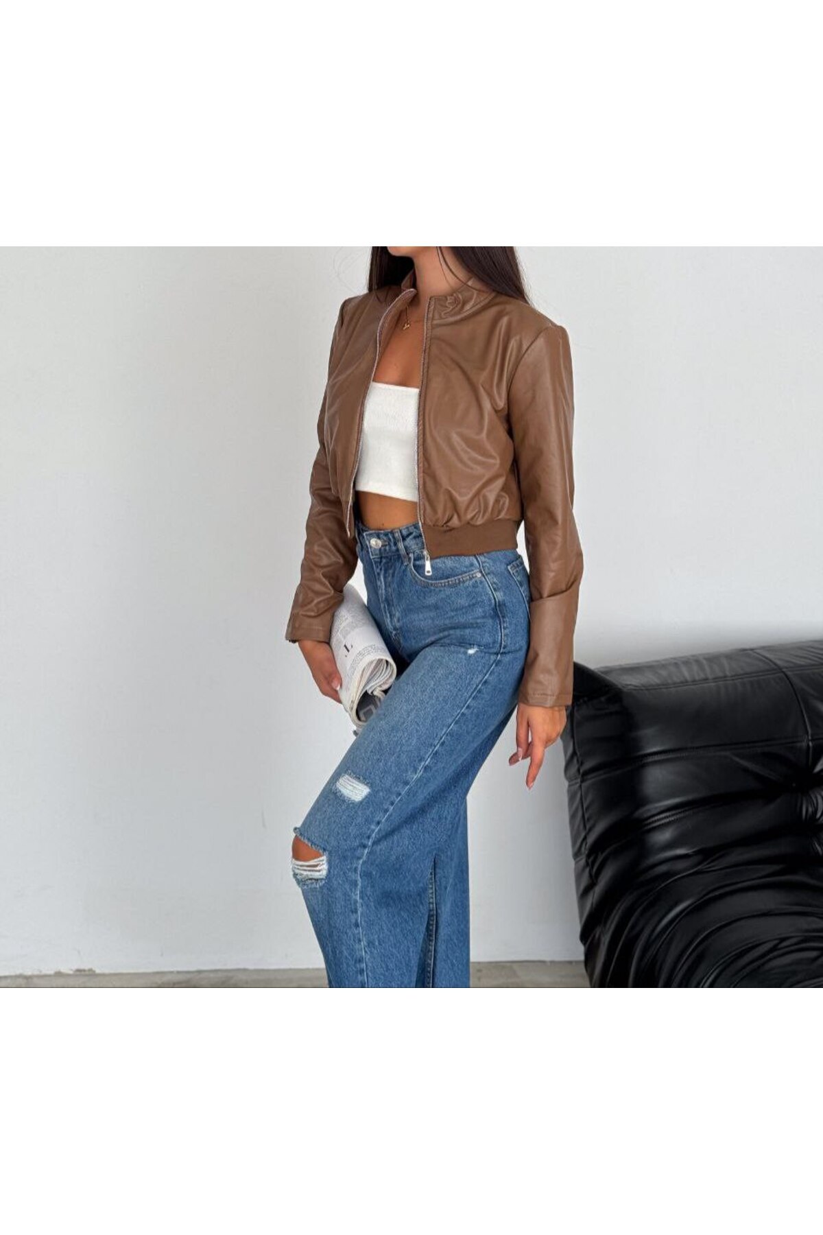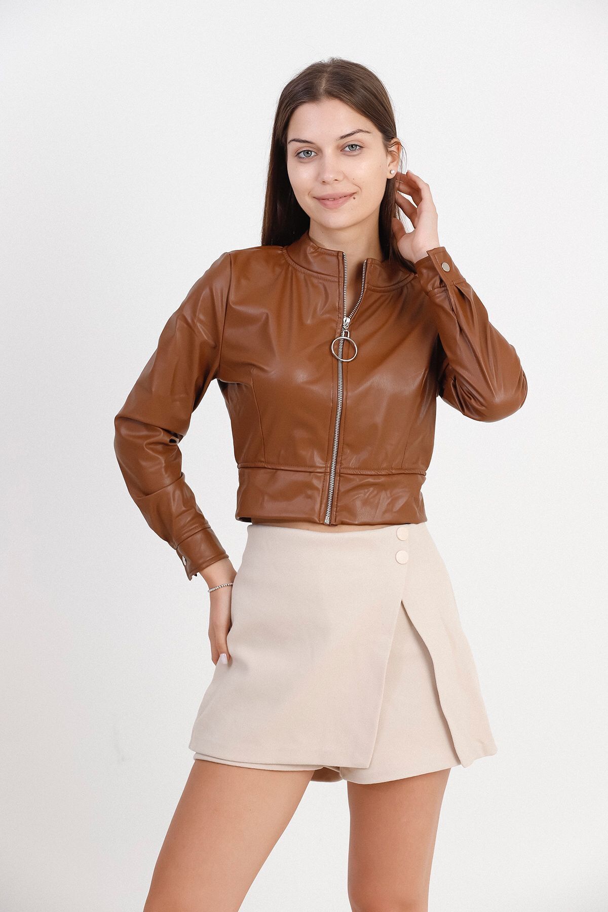 Crop Fermuarlı Basic Deri Ceket Crop Fermuarlı Basic Deri Ceket 267863 XL