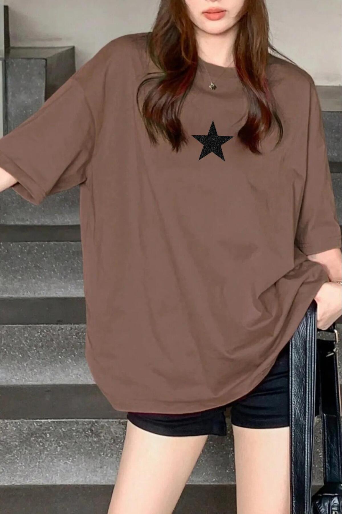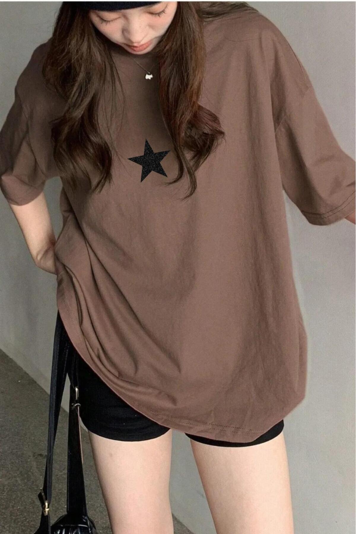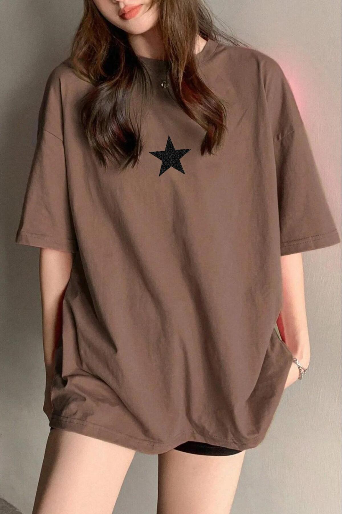 Kadın Kahverengi Oversize Siyah Simli Yıldız Baskılı Trend Bol Kalıp Tshirt Kadın Kahverengi Oversize Siyah Simli Yıldız Baskılı Trend Bol Kalıp Tshirt no60simliyıldıztshirt 2XL