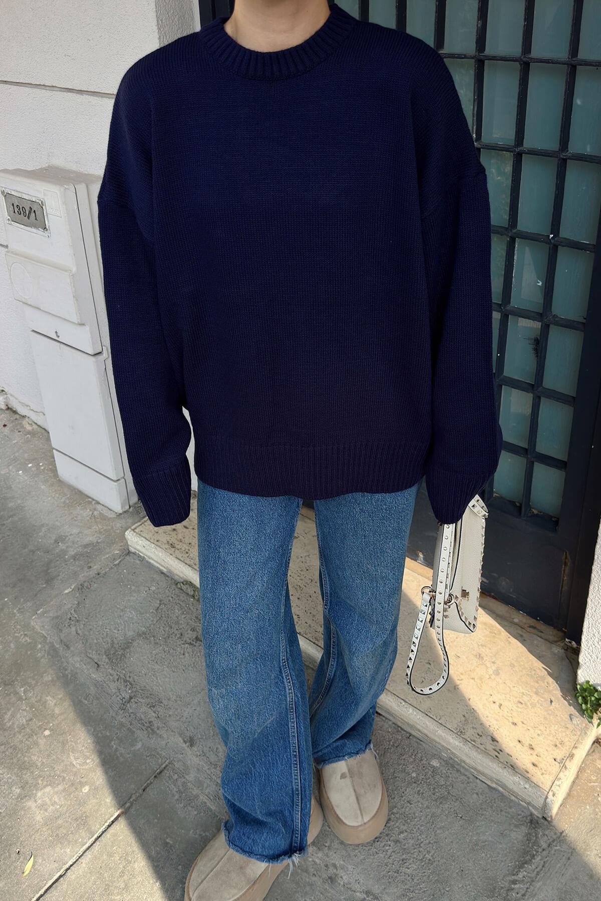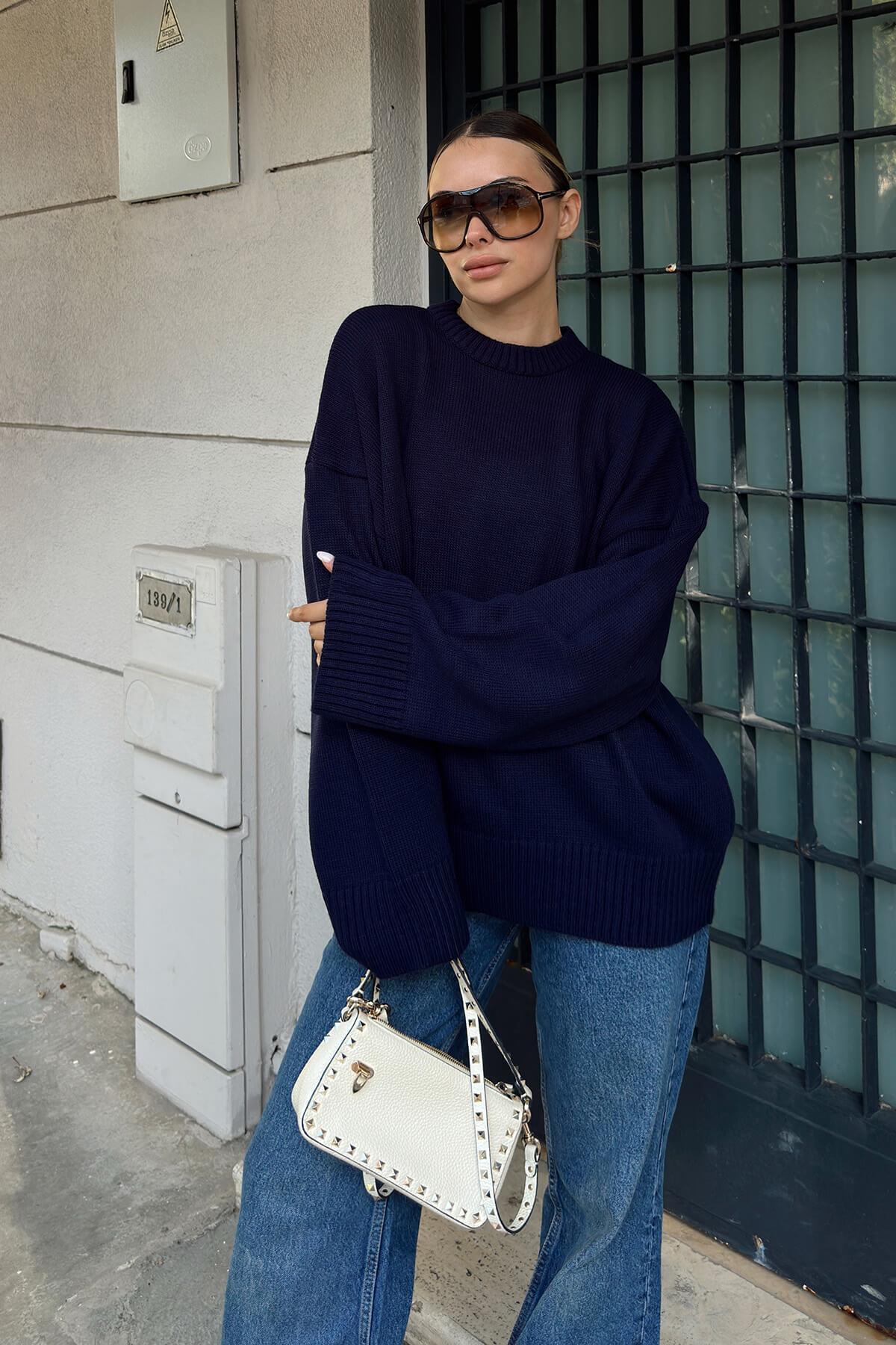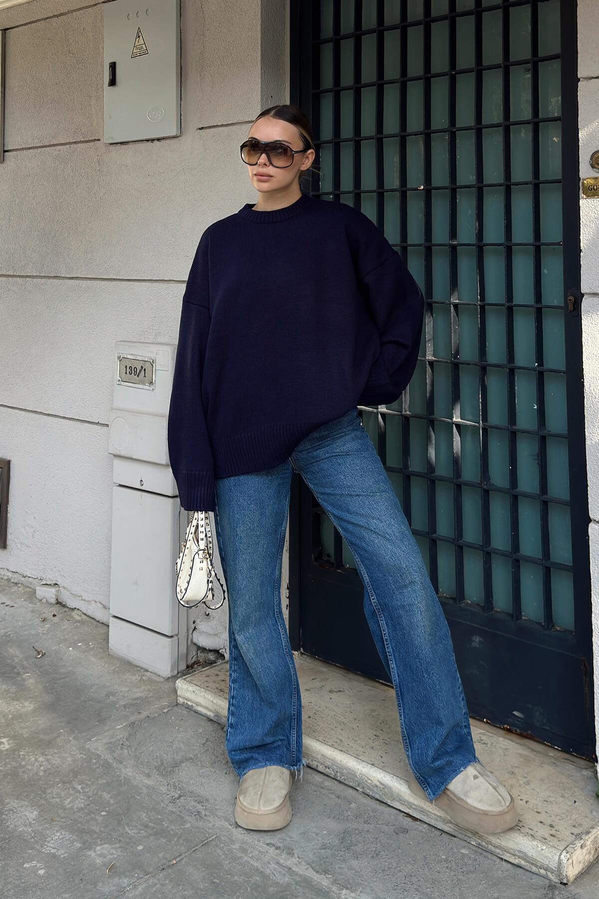 Lacivert Biscuit Bisiklet Yaka Oversize Kadın Triko Kazak Lacivert Biscuit Bisiklet Yaka Oversize Kadın Triko Kazak 26888 Standart