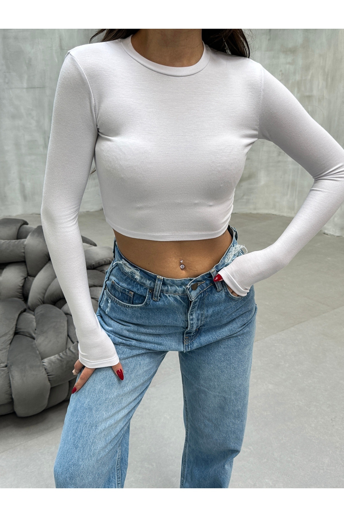 Kadın Beyaz Pamuklu Uzun Kollu Bisiklet Yaka Basic Crop Bluz Kadın Beyaz Pamuklu Uzun Kollu Bisiklet Yaka Basic Crop Bluz VRSCB3349UK L