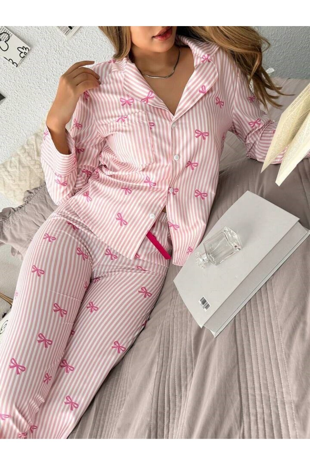 Kadın Düğmeli Uzun Kollu Pijama Takımı Pembe Kurdele Kadın Düğmeli Uzun Kollu Pijama Takımı Pembe Kurdele C-D-01 2XL/3XL