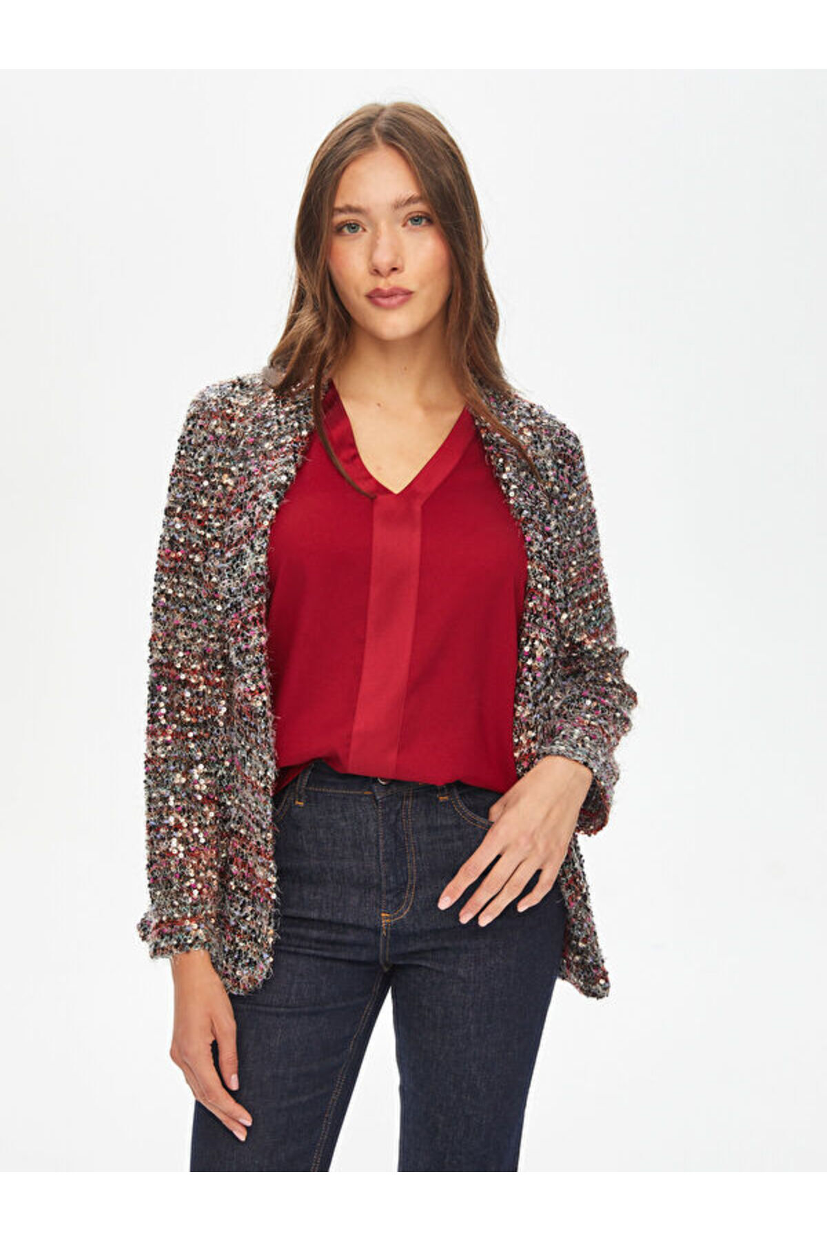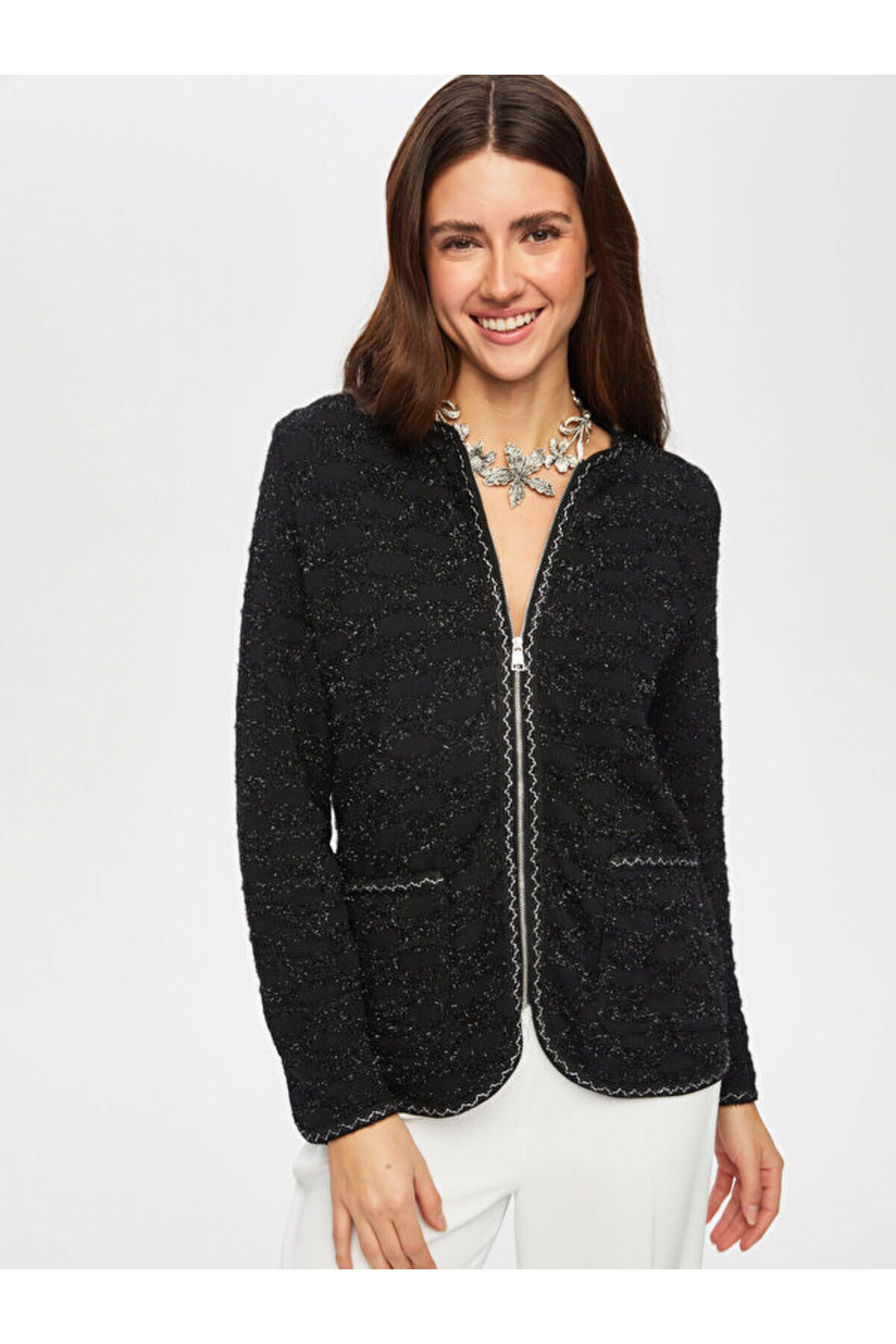 Gold Şerit Detylı Kendinden Jakarlı Örme Ceket S25CKT009 Gold Şerit Detylı Kendinden Jakarlı Örme Ceket S25CKT009 US25CKT009 XL