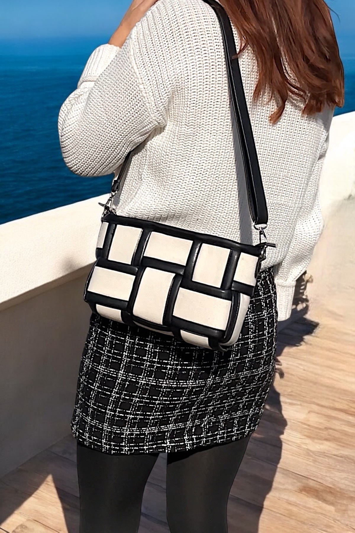 Kadın kanvas örgü detaylı siyah-krem el ve omuz çantası Kadın kanvas örgü detaylı siyah-krem el ve omuz çantası KNV56900 تک سایز