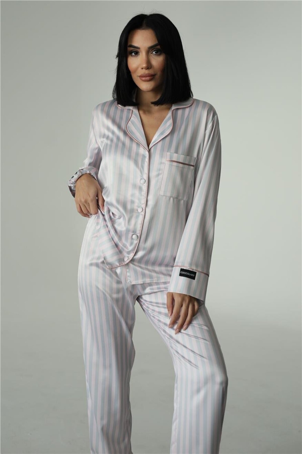 Strisce Rosa Chiaro Grigio Saten Uzun Pijama Takımı Strisce Rosa Chiaro Grigio Saten Uzun Pijama Takımı 1493 XL