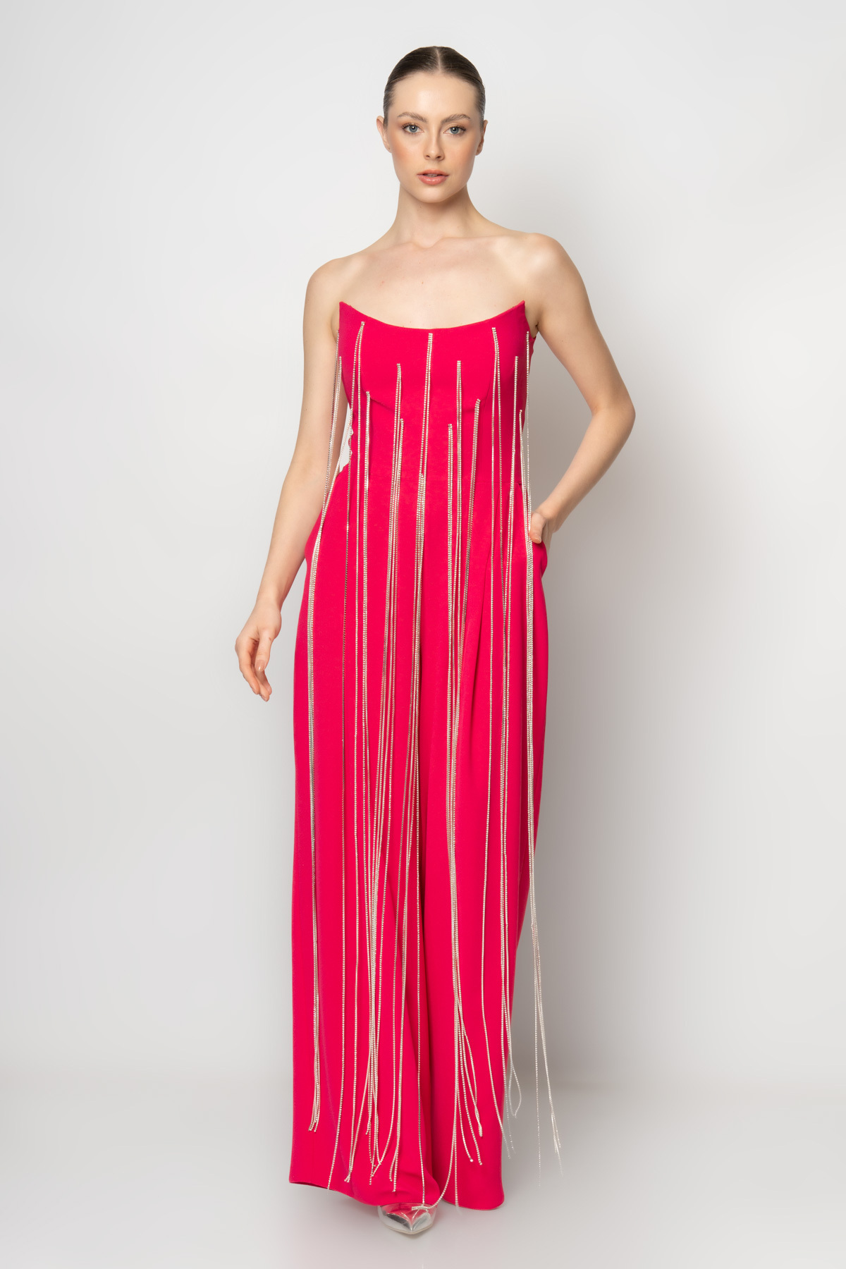 Kedi yakalı uzun taş şerit saçaklı krep abiye tulum Kedi yakalı uzun taş şerit saçaklı krep abiye tulum 6296 48