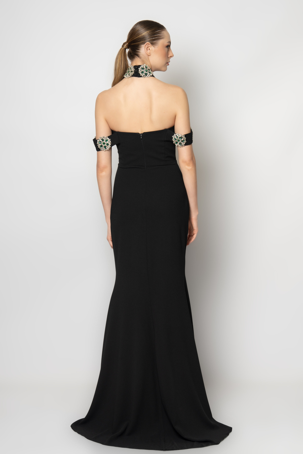Yakası ve boynu daire taş aksesuarlı krep abiye elbise Yakası ve boynu daire taş aksesuarlı krep abiye elbise 6301 42