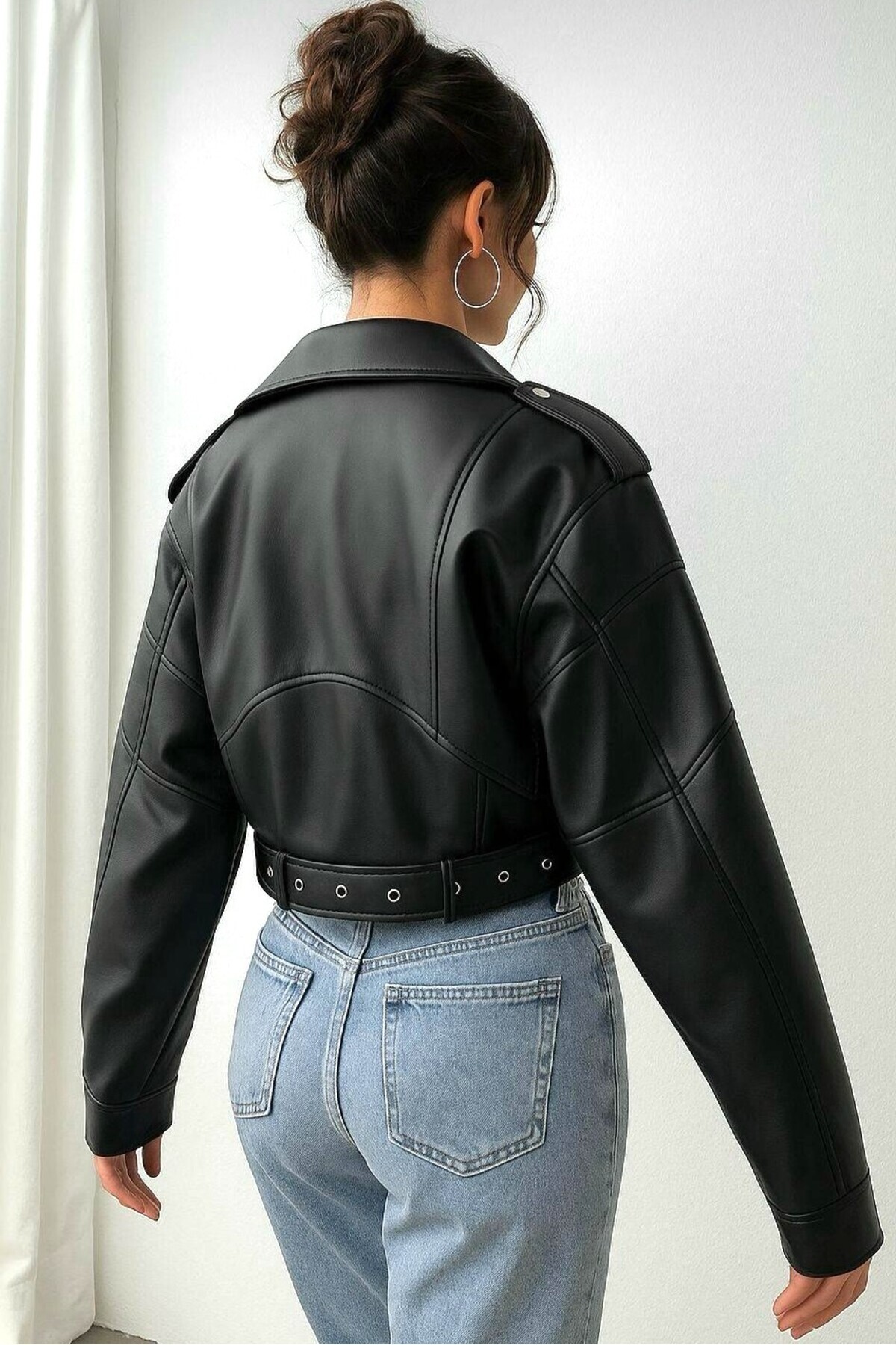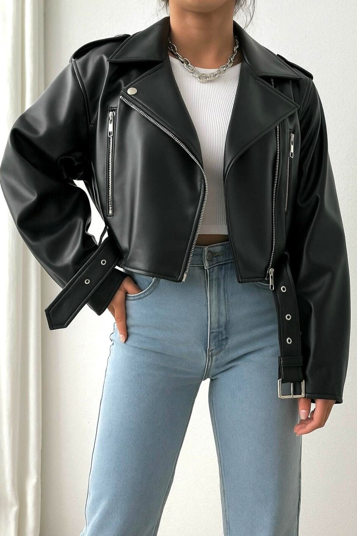 Kemerli Siyah Crop Deri Ceket Kemerli Siyah Crop Deri Ceket BKC0056 XL