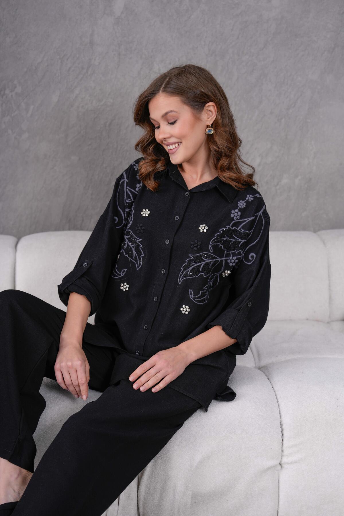 NAKIŞ İŞLEMELİ TAŞLI KETEN TAKIM NAKIŞ İŞLEMELİ TAŞLI KETEN TAKIM 117310 XL