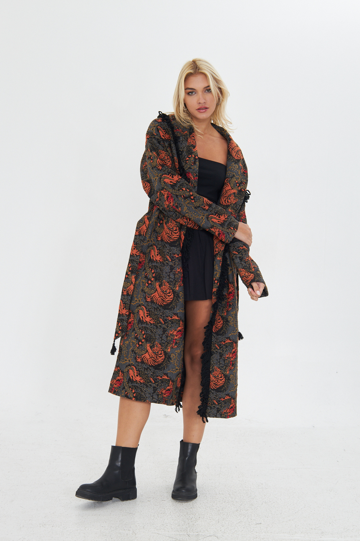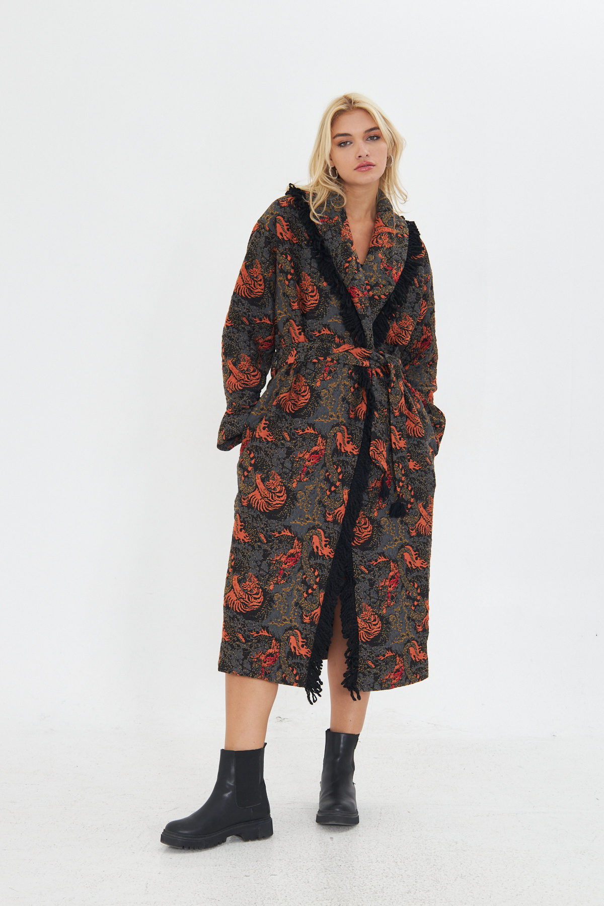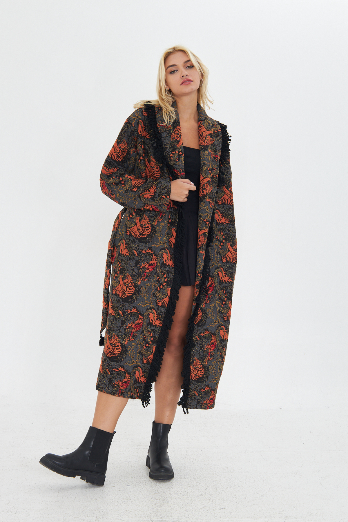 Bohem Kaplan Figurlu Şal Yaka Detaylı Astarlı MAxi Boy Kaban Bohem Kaplan Figurlu Şal Yaka Detaylı Astarlı MAxi Boy Kaban gzd24012501 44