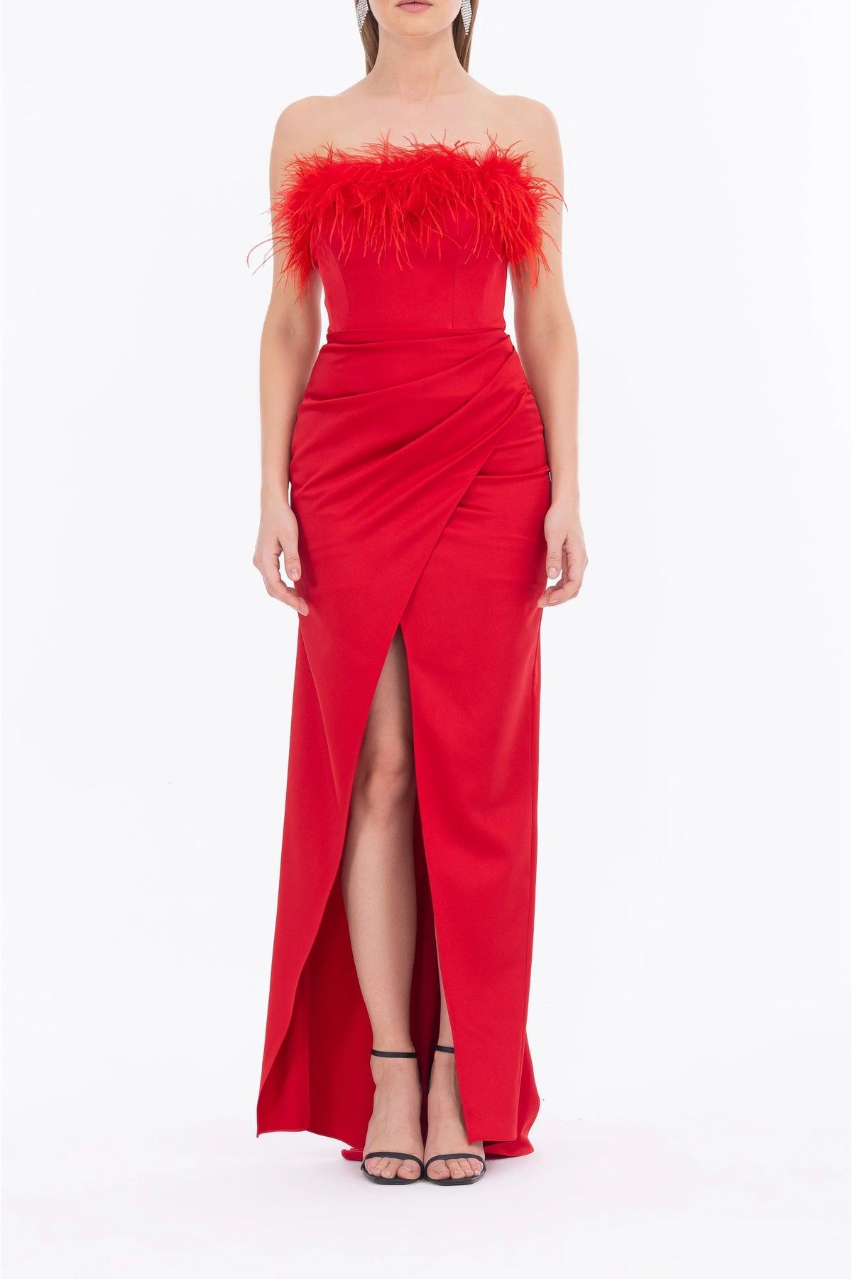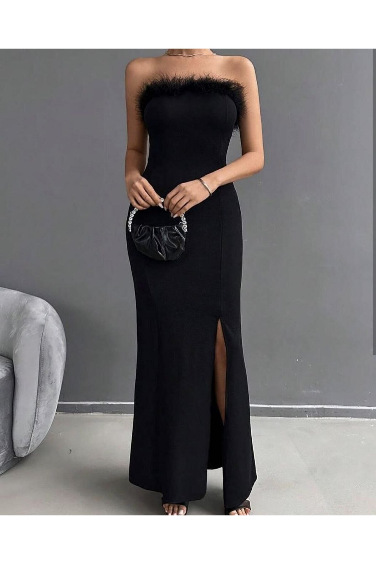 STRAPLEZ KISMI PELUŞ TÜY DETAYLI YIRTMAÇLI UZUN ABİYE ELBİSE 757 583152 STRAPLEZ KISMI PELUŞ TÜY DETAYLI YIRTMAÇLI UZUN ABİYE ELBİSE 757 583152 MAT-757 3XL