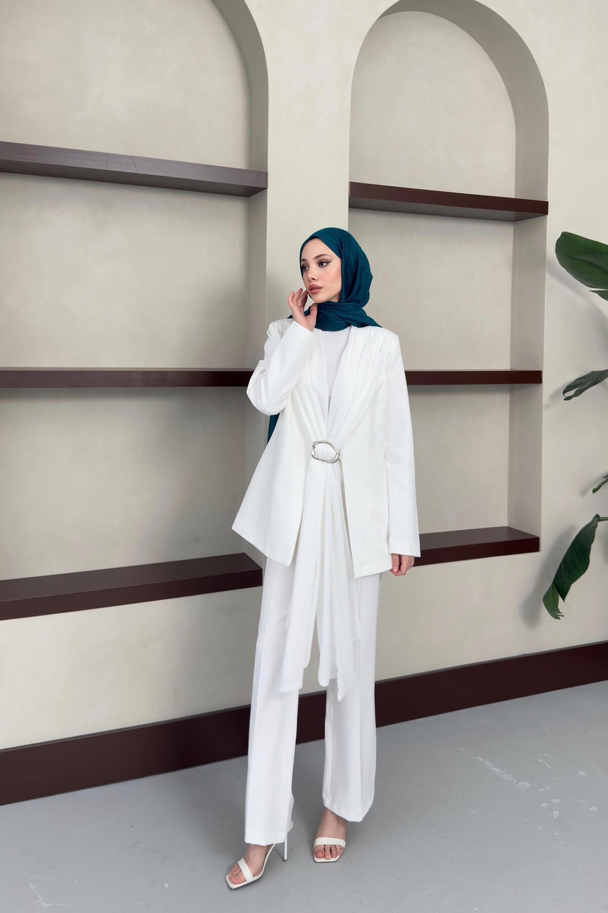 Önden Fularlı Pantolonlu Takım - Ekru Önden Fularlı Pantolonlu Takım - Ekru MY-02133 L