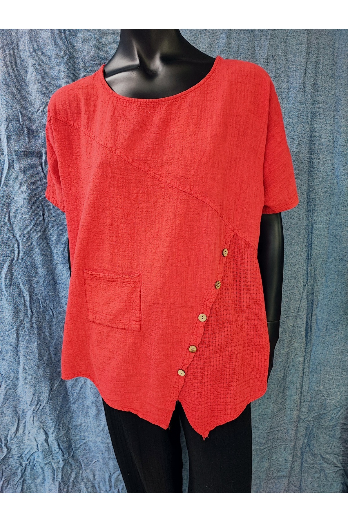 Pamuk Keten Asimetrik Kesim Düğmeli Cepli Bluz Pamuk Keten Asimetrik Kesim Düğmeli Cepli Bluz RO2025-012 Standart