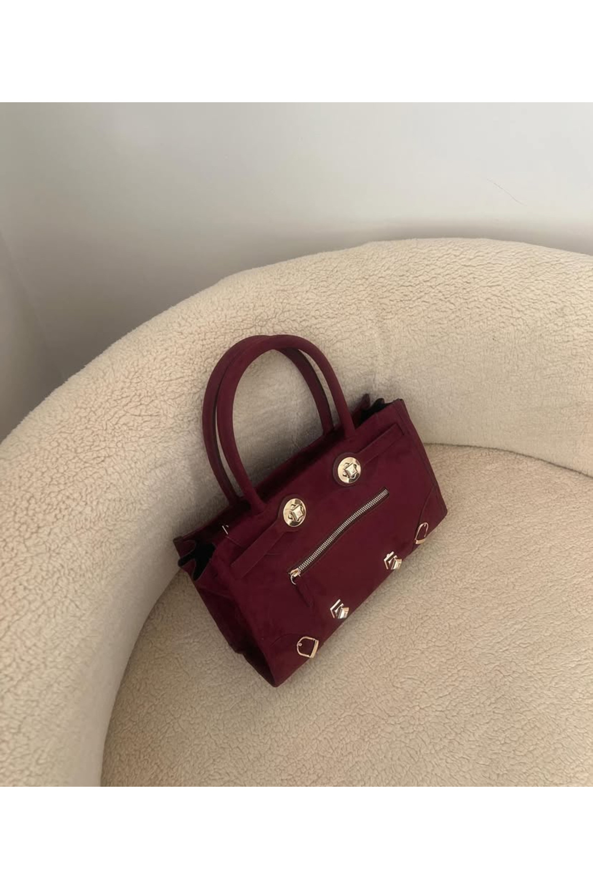 Kadın Süet Bordo Gold Detaylı El Ve Omuz Çantası Kadın Süet Bordo Gold Detaylı El Ve Omuz Çantası BST تک سایز