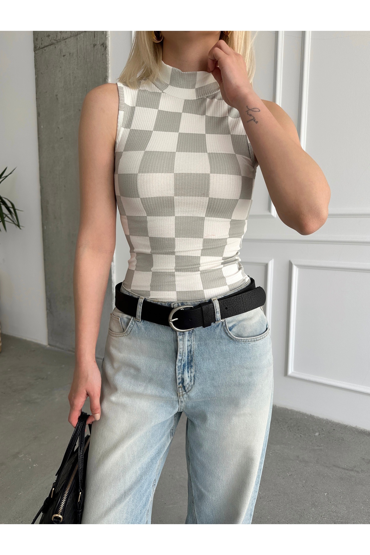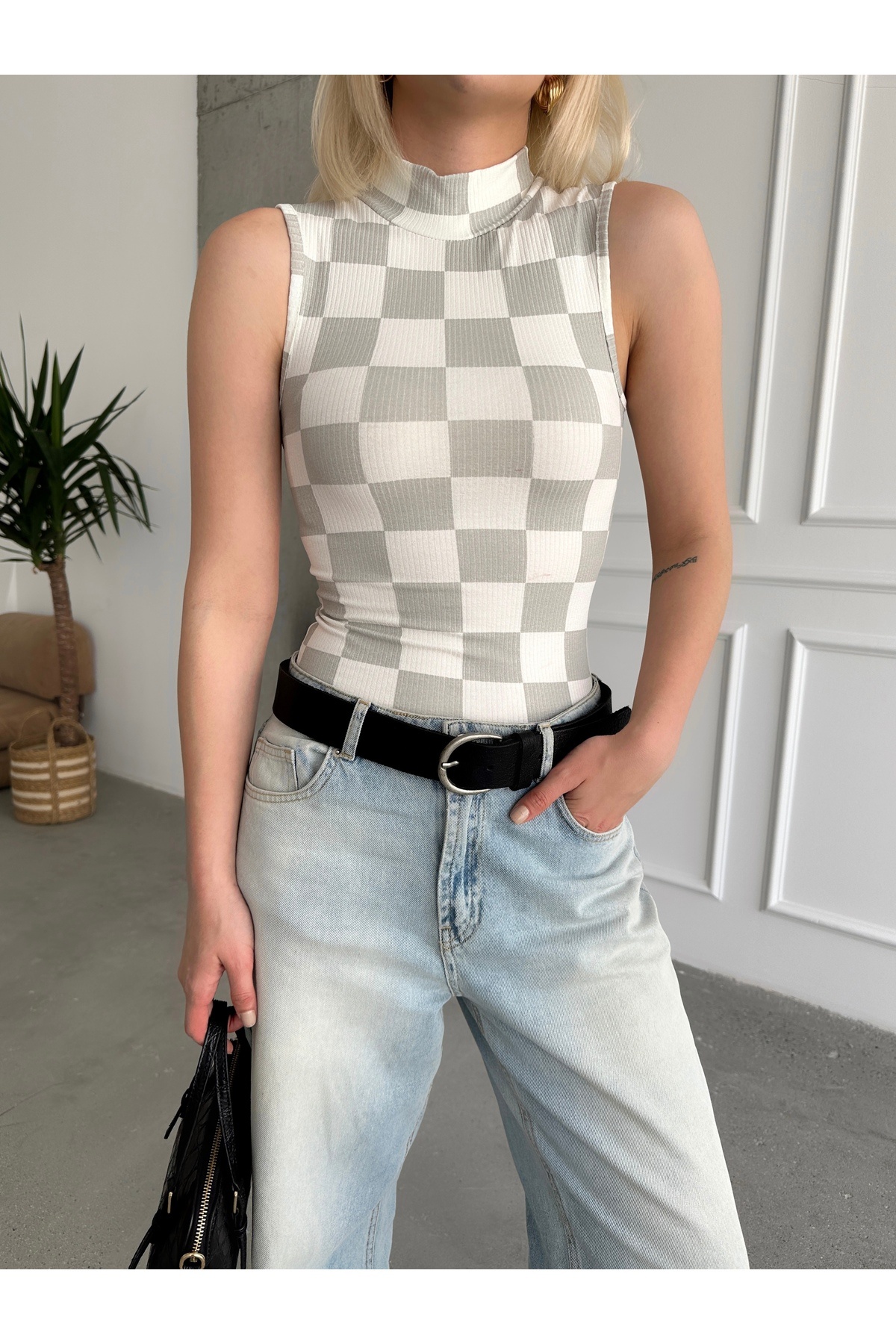 Kadın Ekru Kare Desenli Dik Yaka Sıfır Kollu Viskon Kaşkorse Bluz Kadın Ekru Kare Desenli Dik Yaka Sıfır Kollu Viskon Kaşkorse Bluz MR-1176 L