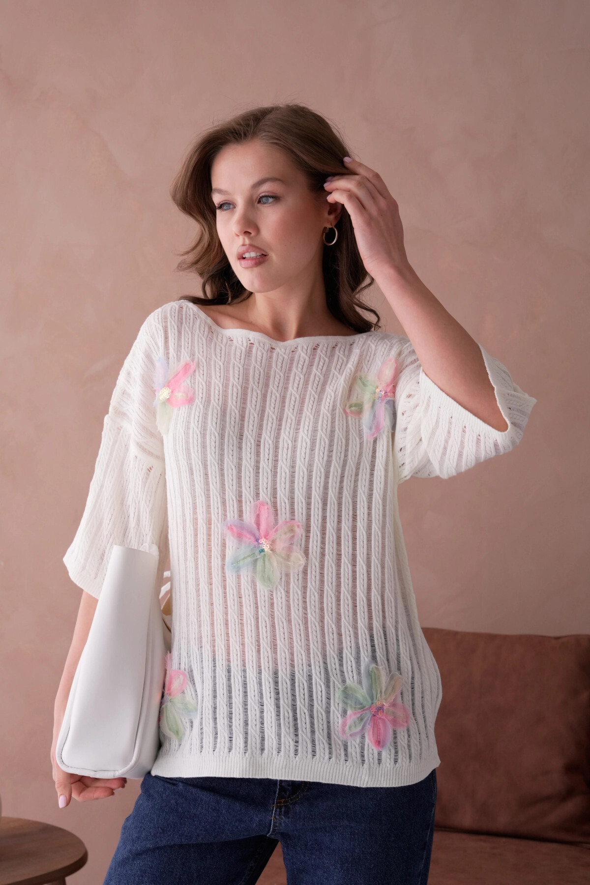 Kadın Bisiklet Yaka Gül Detay Kısa Kol Triko Kazak Kadın Bisiklet Yaka Gül Detay Kısa Kol Triko Kazak 10746 Standart