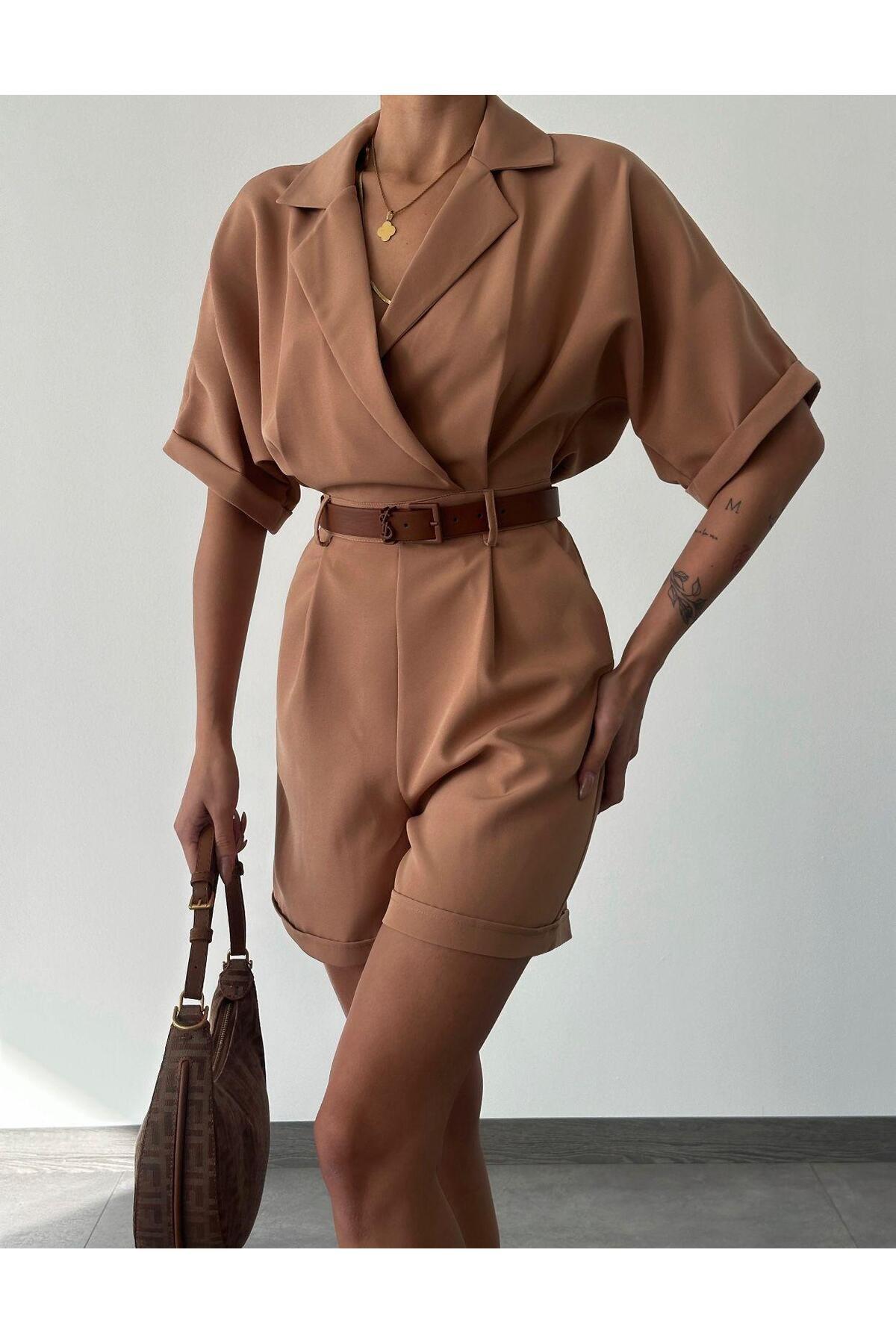 Kadın Kahverengi Atlas Kumaş Şort Tulum Kadın Kahverengi Atlas Kumaş Şort Tulum elj8000 L