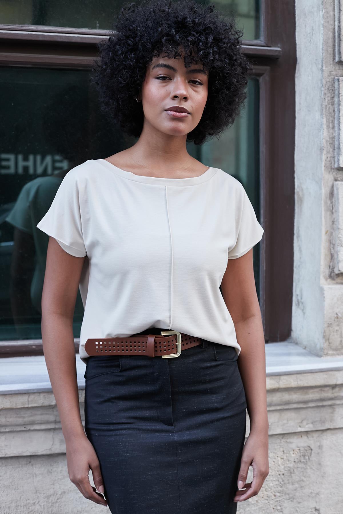 Kadın Likrasız Şık Span Kumaş Kayık Yaka Önü Dikişli Düşük Omuzlu T-shirt Bluz-Beyaz Kadın Likrasız Şık Span Kumaş Kayık Yaka Önü Dikişli Düşük Omuzlu T-shirt Bluz-Beyaz 20525 XL