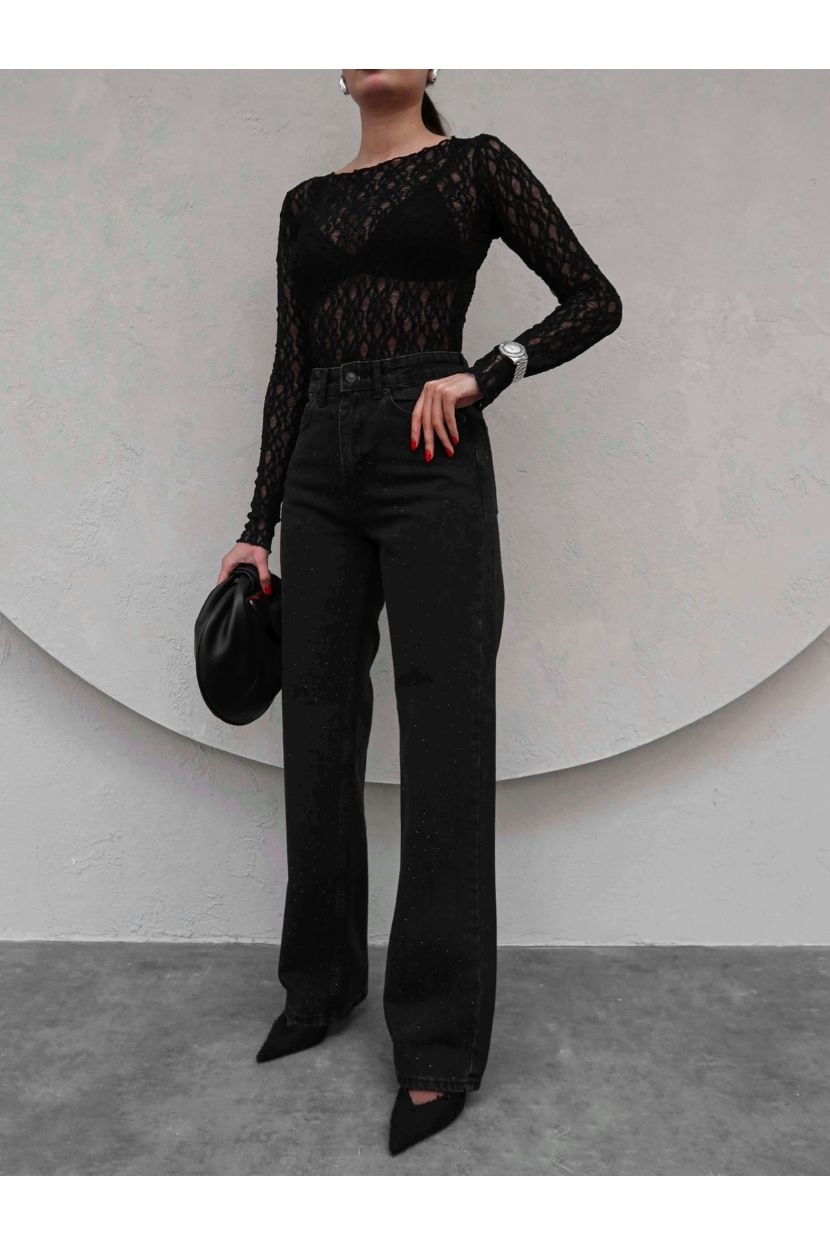 Siyah Taşlı Geniş Paça Jean Pantolon Siyah Taşlı Geniş Paça Jean Pantolon EH-5273 XL