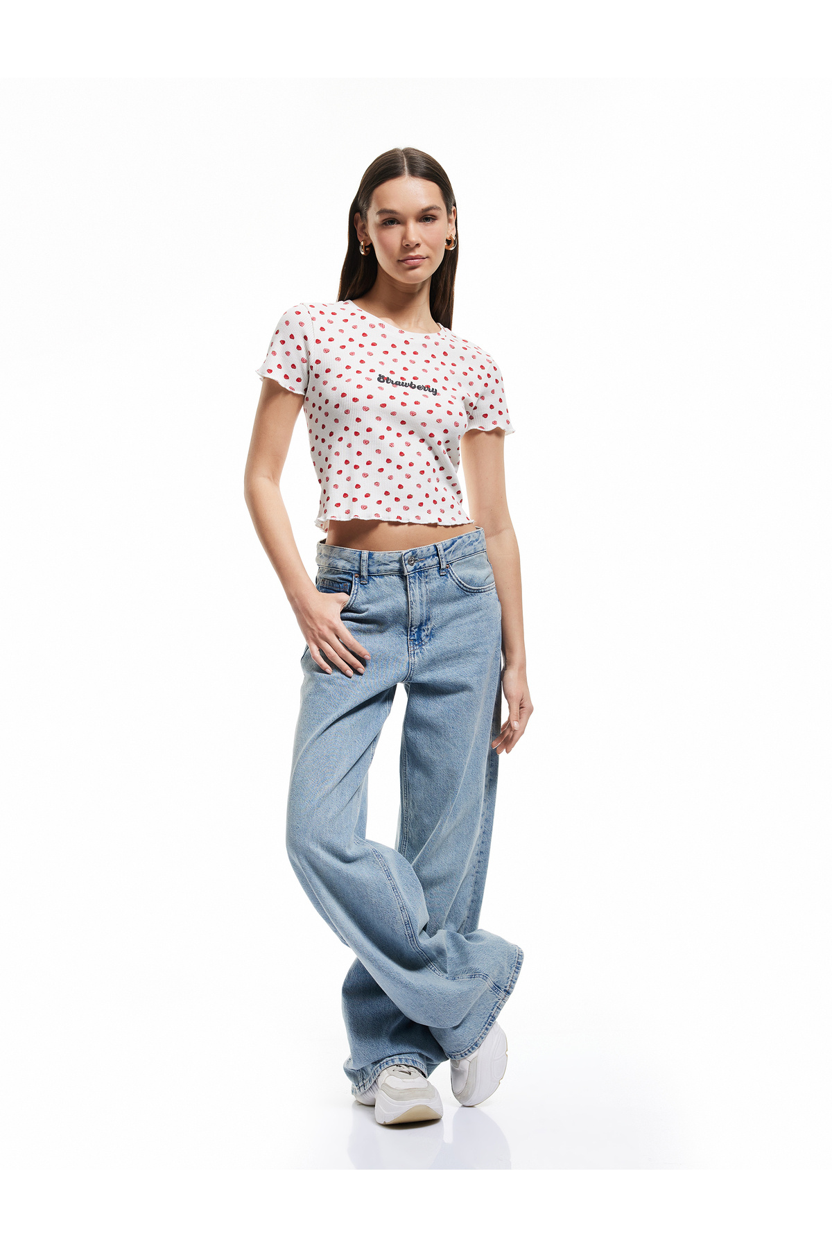 Kısa Kollu Crop Bisiklet Yaka Çilek Baskılı Tişört Kısa Kollu Crop Bisiklet Yaka Çilek Baskılı Tişört 5SAL10021IK XL