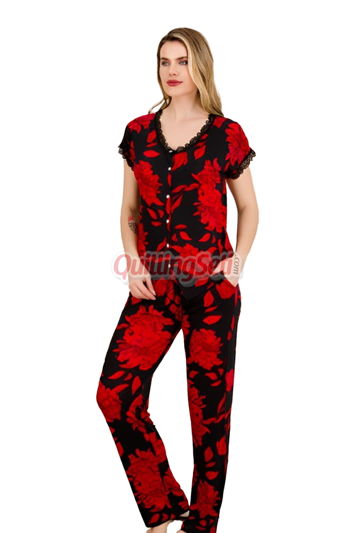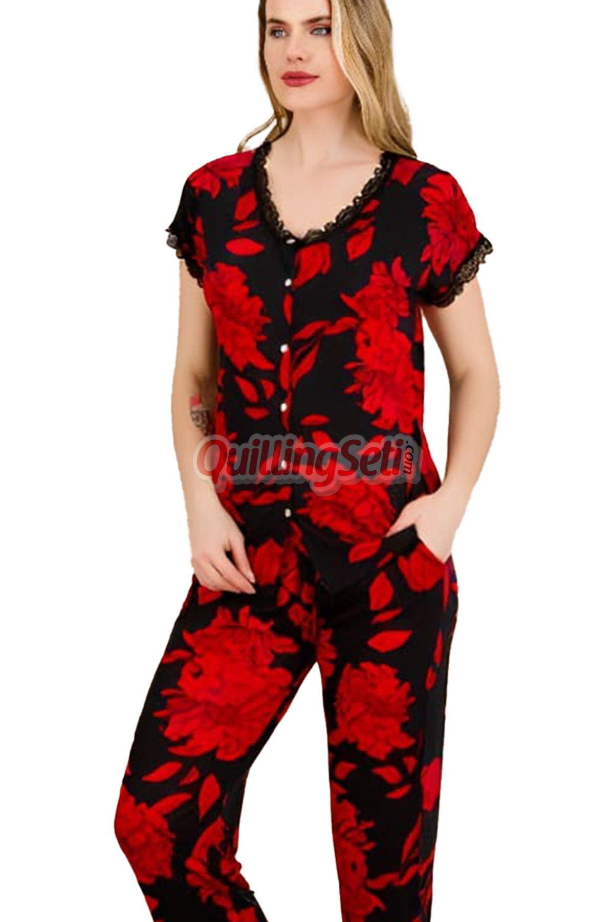 Kırmızı - Siyah Renk ve Çiçek Desenli Lady 12494 Pamuk Viskon Kadın Kısa Kol Pijama Takımı Kırmızı - Siyah Renk ve Çiçek Desenli Lady 12494 Pamuk Viskon Kadın Kısa Kol Pijama Takımı LADY-12494 XL