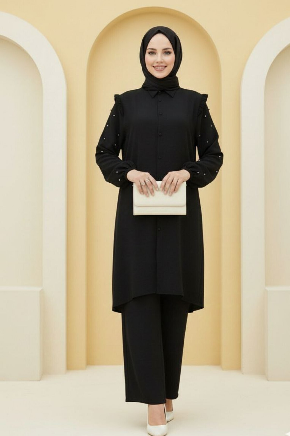 JALA TAKIM Siyah İnci Detaylı Tesettür Tunik Pantolon Takım Aerobin Kumaş Şık ve Rahat JALA TAKIM Siyah İnci Detaylı Tesettür Tunik Pantolon Takım Aerobin Kumaş Şık ve Rahat 21/2738 60