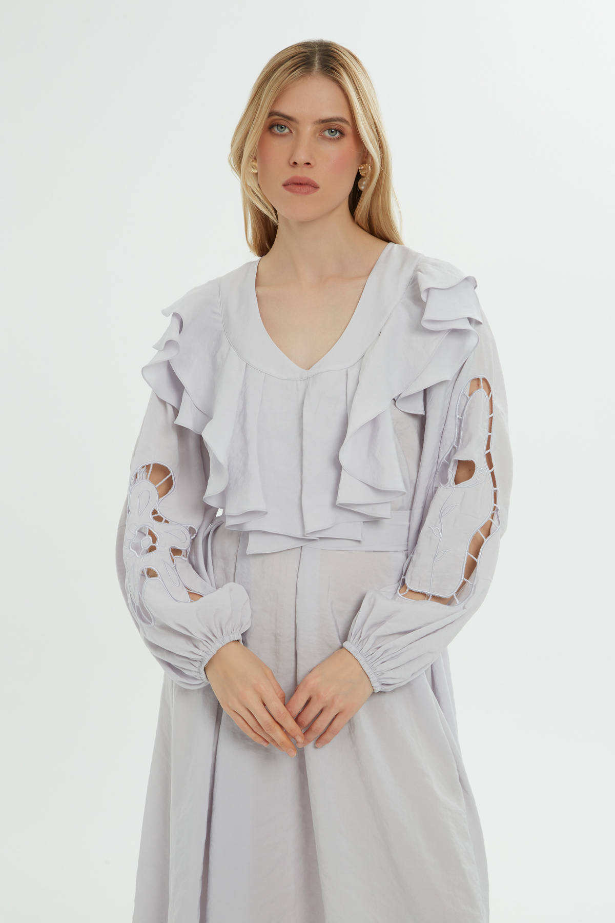 Volan Detaylı Nakışlı Gri Uzun Elbise Volan Detaylı Nakışlı Gri Uzun Elbise M5YM5L0851 46