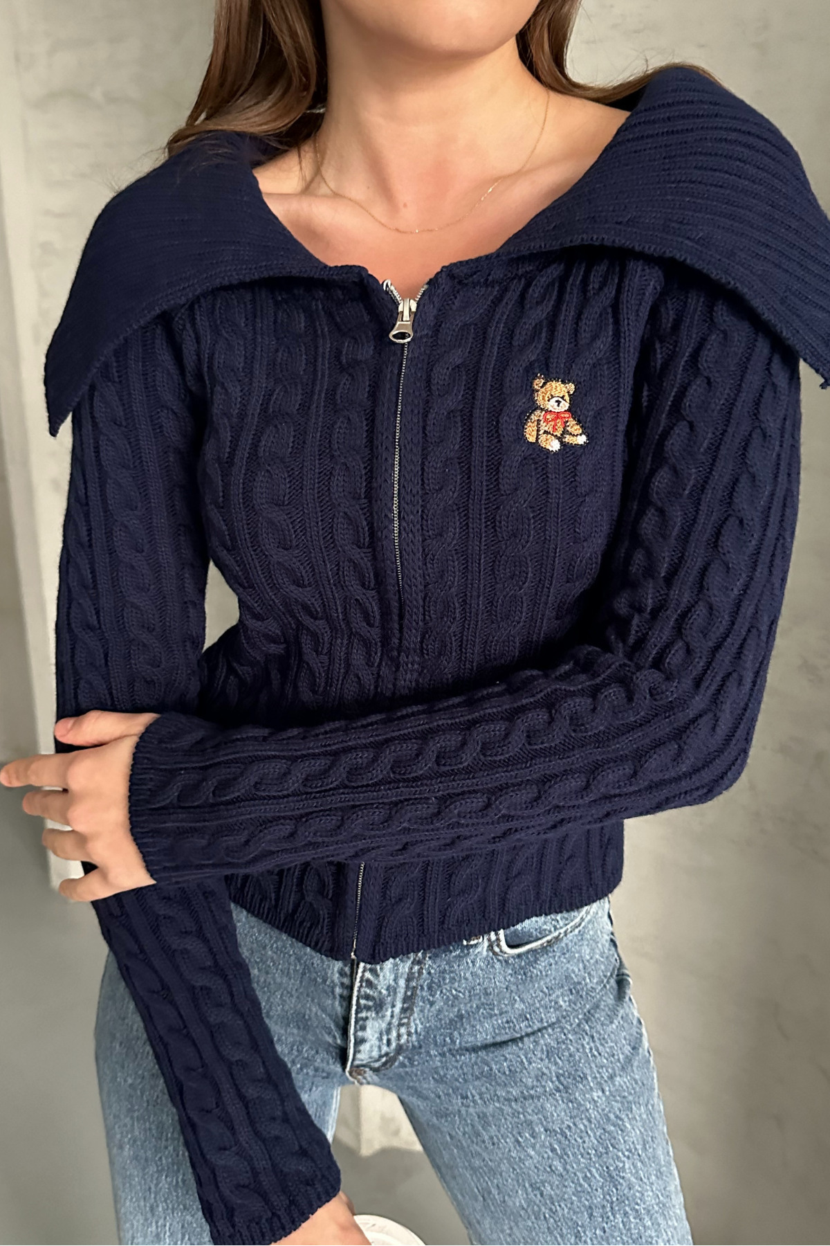 Ayıcık Desenli Devrik Yaka Fermuarlı Triko Hırka Ayıcık Desenli Devrik Yaka Fermuarlı Triko Hırka 2924 Standart