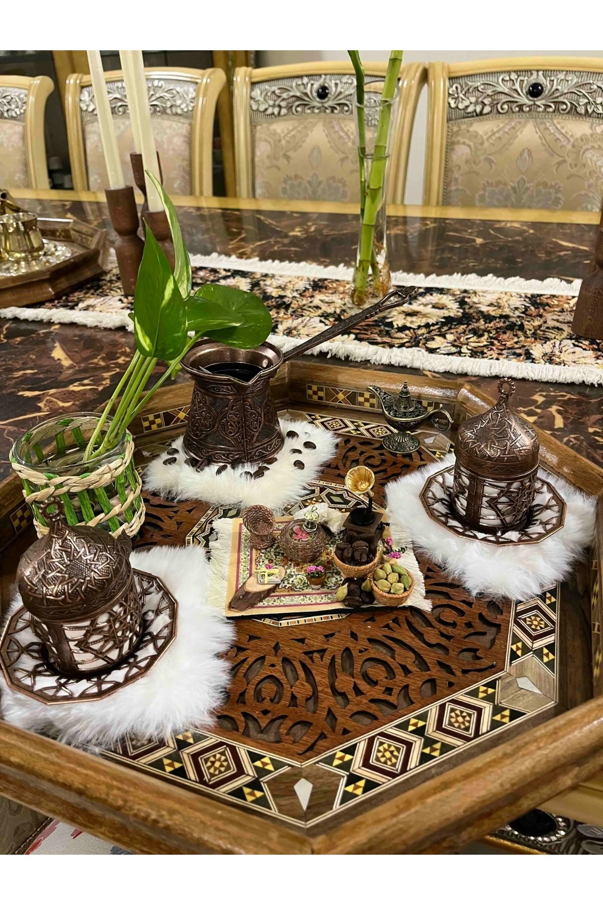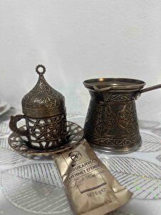 4 kişilik oymalı döküm cezve ve bakır işlemeli Türk kahve fincanı 4 kişilik oymalı döküm cezve ve bakır işlemeli Türk kahve fincanı ve_141 تک سایز