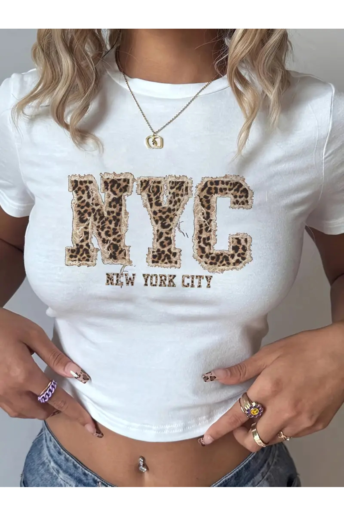 New York Leopar Desen Baskılı Kadın T-shirt New York Leopar Desen Baskılı Kadın T-shirt NYe3423234 5XL